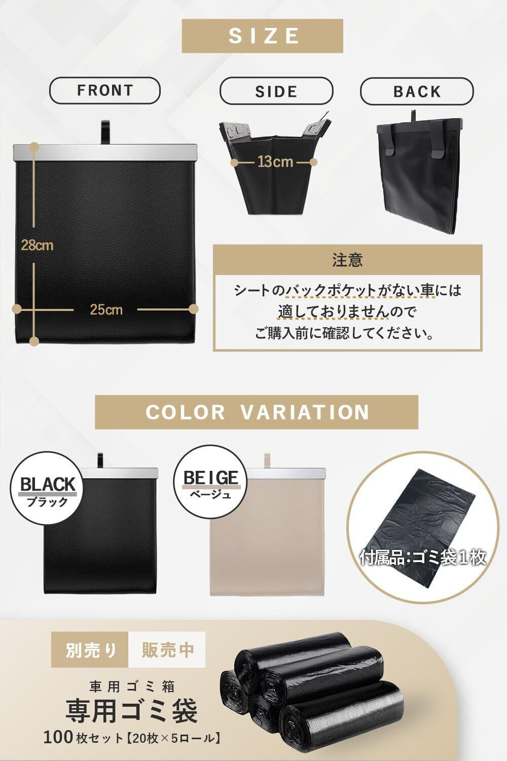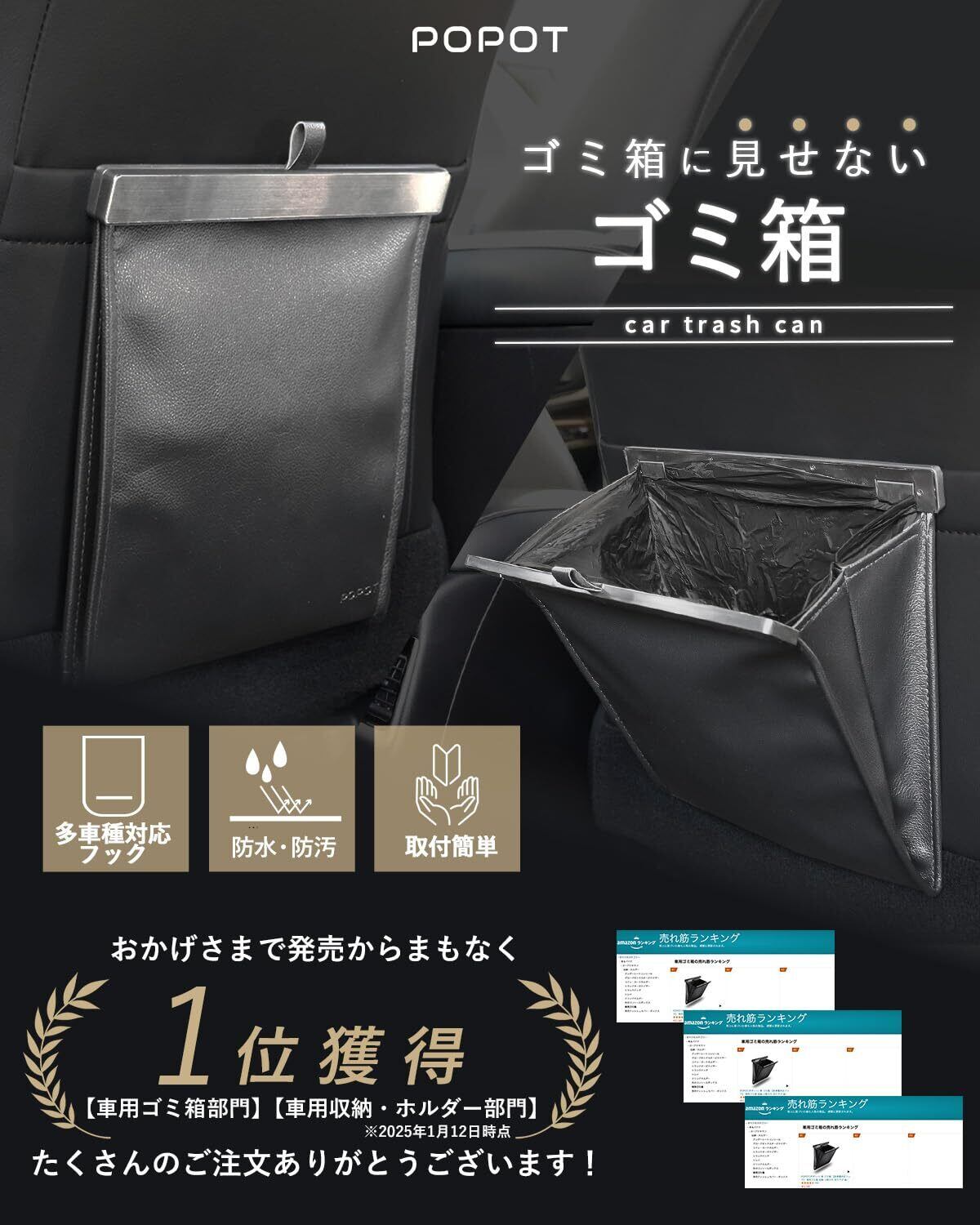 POPOT(ポポット) 車 ゴミ箱 【多車種対応フック】 車用ゴミ箱 スリム 収納 小物入れ 袋付き カー用品 便利グッズ (ブラック)