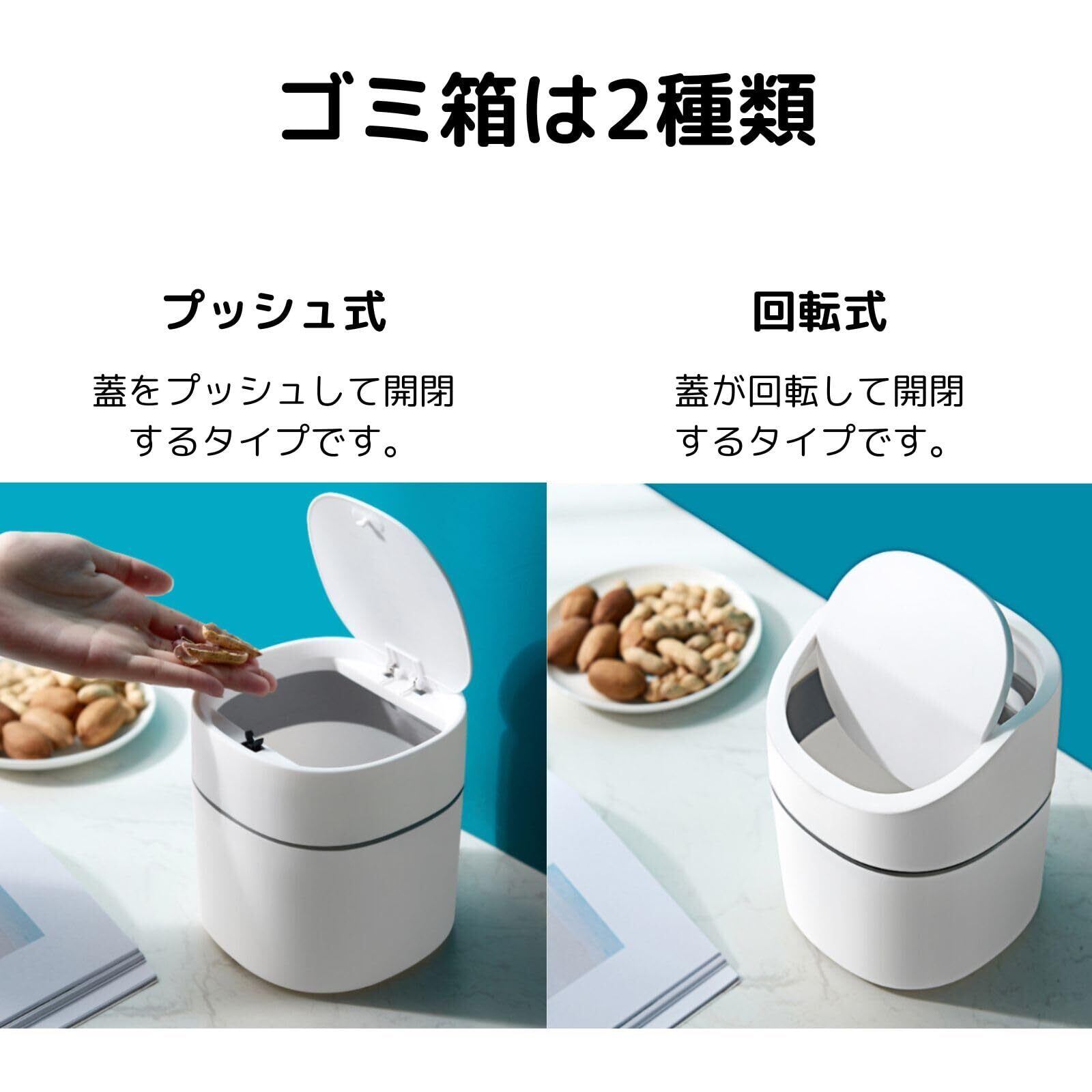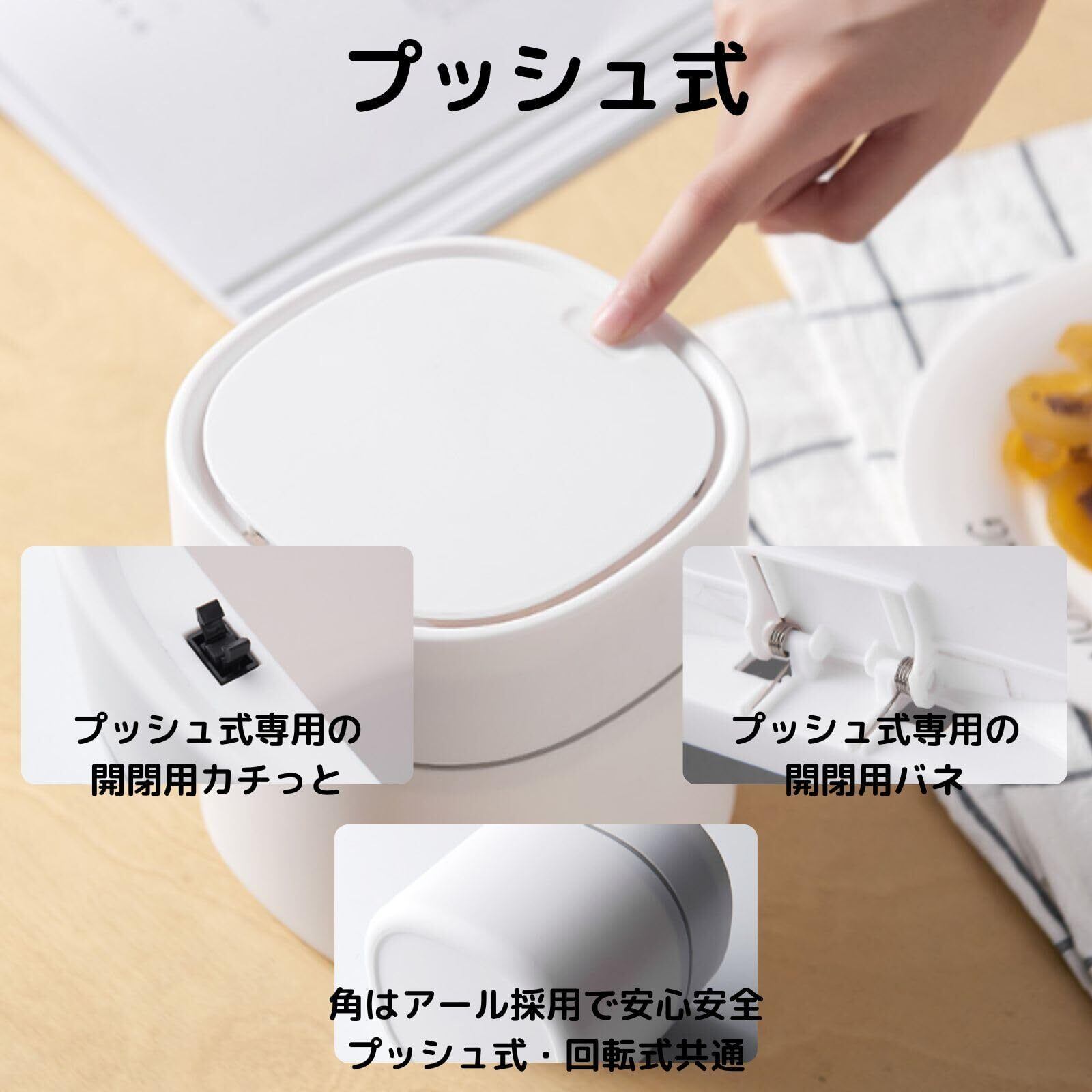 【臭わない】かわいいコンパクトなふた付きゴミ箱です。密閉されているので臭いをシャットアウトします。回転式は回転式のふたで開閉出来ます。プッシュ式はプッシュ式のふたで開閉出来ます。