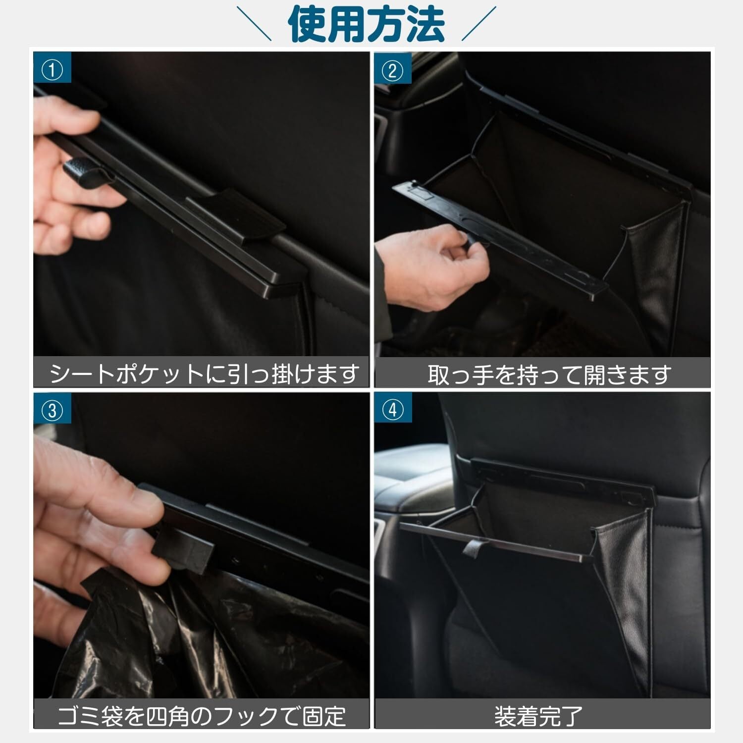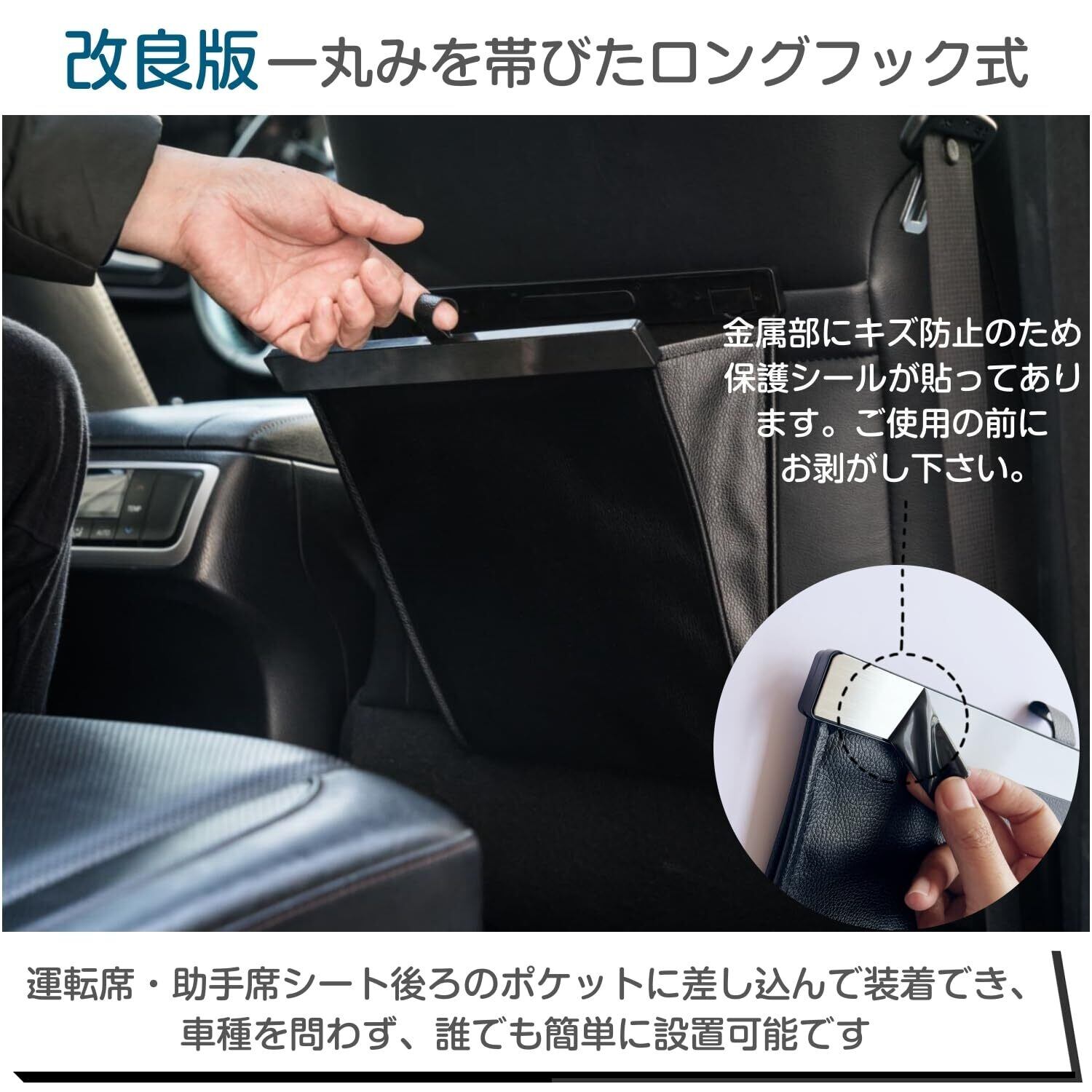 【最新改良版フック】しっかり固定できるロングフックを採用し、従来品での「外れやすい」との課題を解消し外れにくい仕様に改良いたしました。見た目もおしゃれ!背面クリップ式なので、運転席側、助手席側のサイドポケットはもちろん、後部座席のサイドポケットや車ドア、シートバックのポケットに固定して使用することができます。小物を収納する車用収納ケースとしても、おすすめしたい便利グッズです。充電ケーブル、スマホ、本、子供の玩具、お菓子などの小物を収納するのに最適です!車の中で大活躍間違いなし!