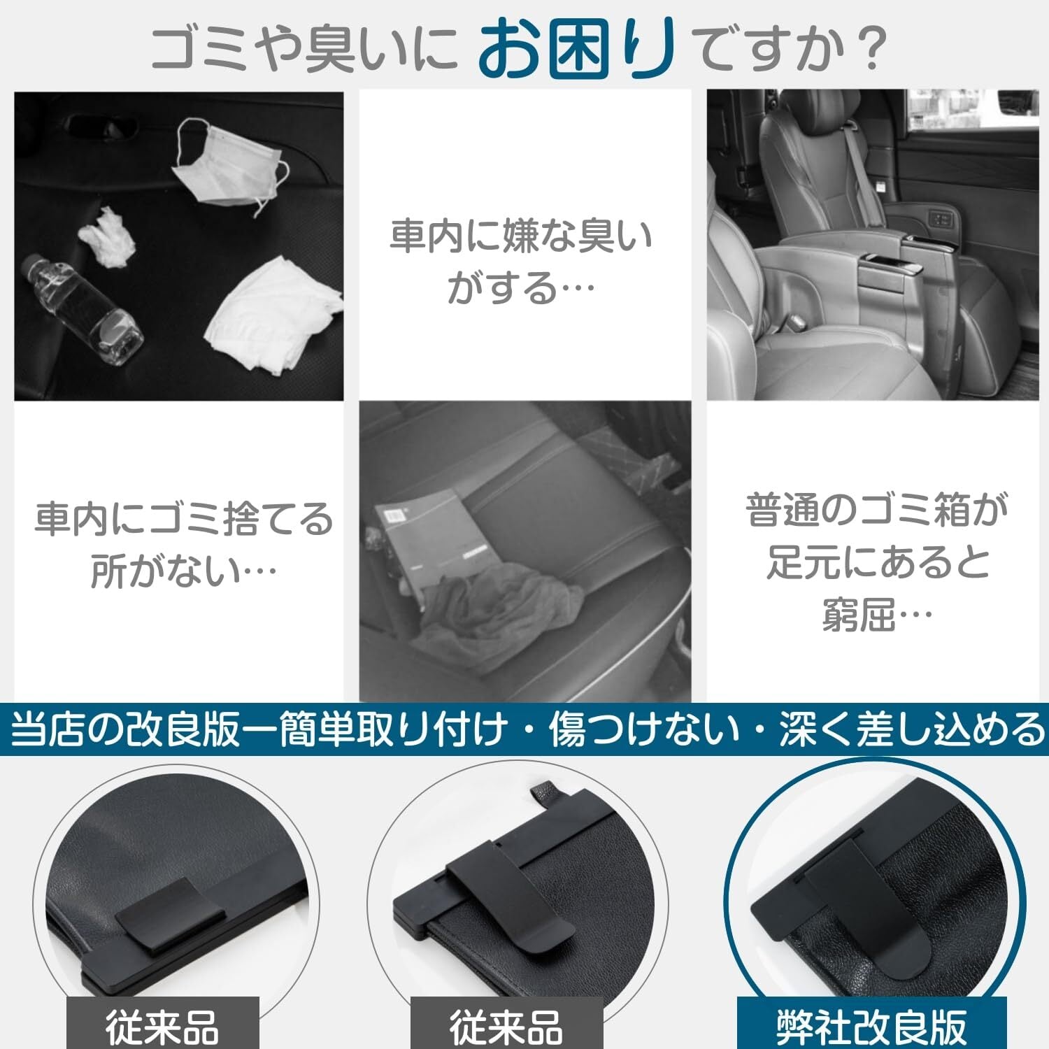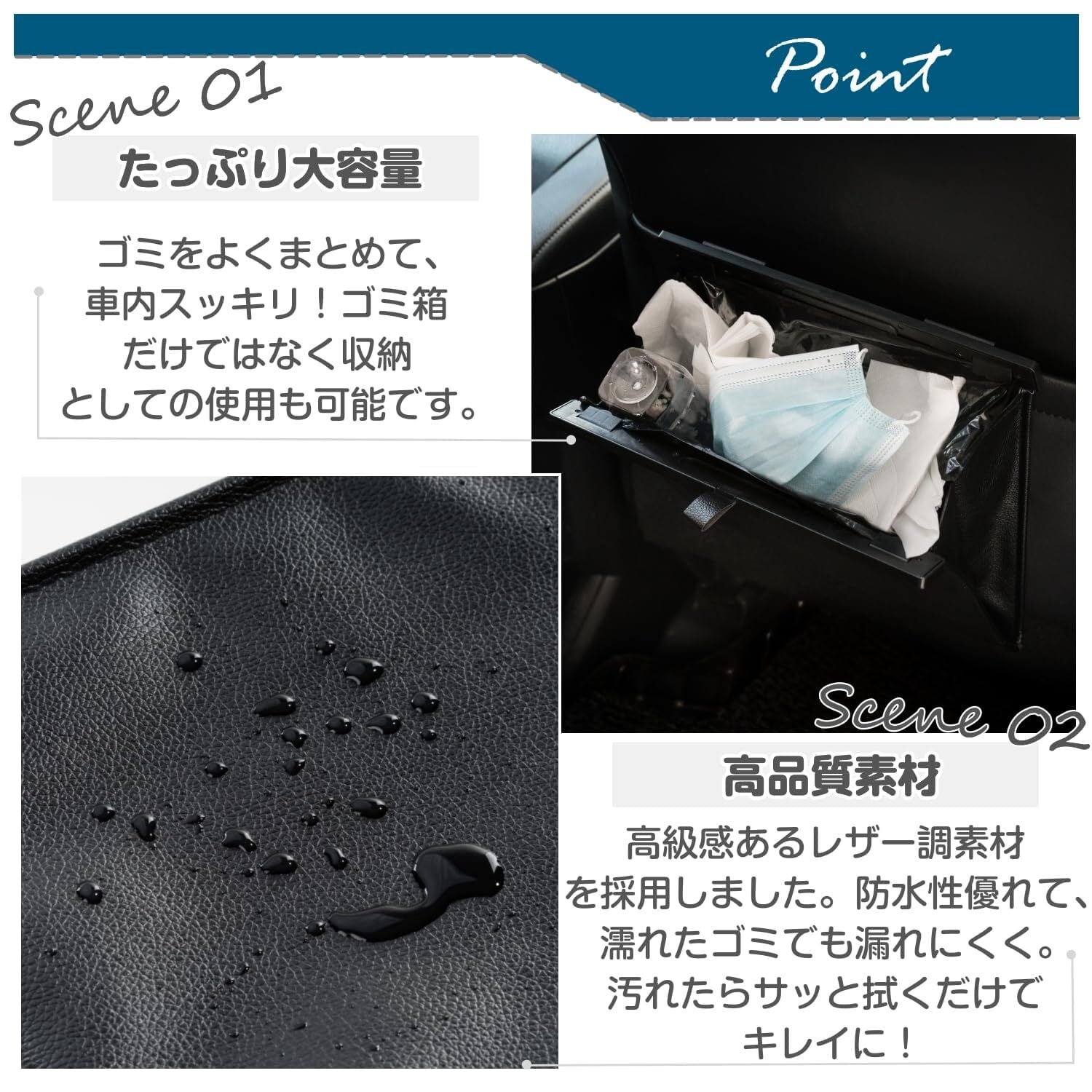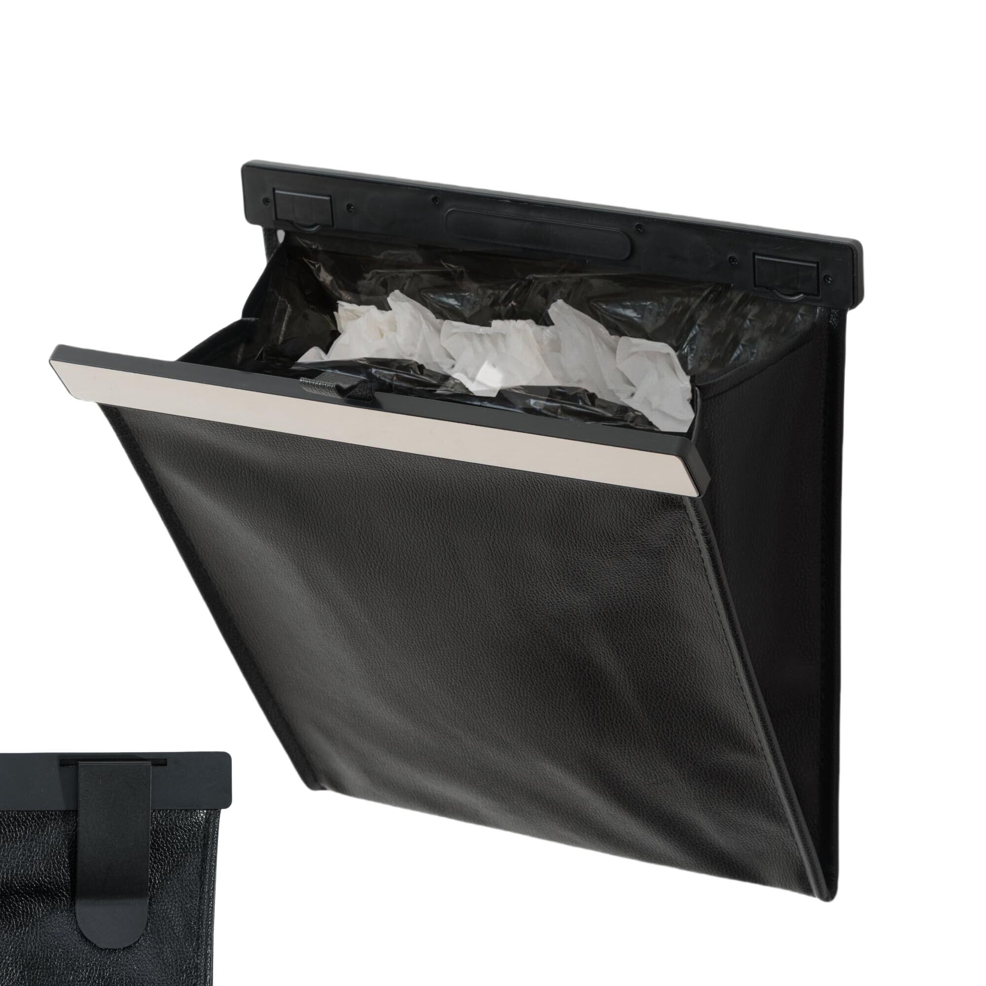【ゴミ捨てに便利】12枚ゴミ袋付き!高品質なPU素材が採用されており、質感や手触りにも優れて素材の異臭もありません。内装に合わせたカラーで、高級感が漂います。防水性や防汚性、耐磨耗性があり、外部の汚れは濡れたタオルで簡単に拭き取ることができます。内側の4隅に袋を固定できるクリップが付いています。そのままゴミを捨てることもできます。