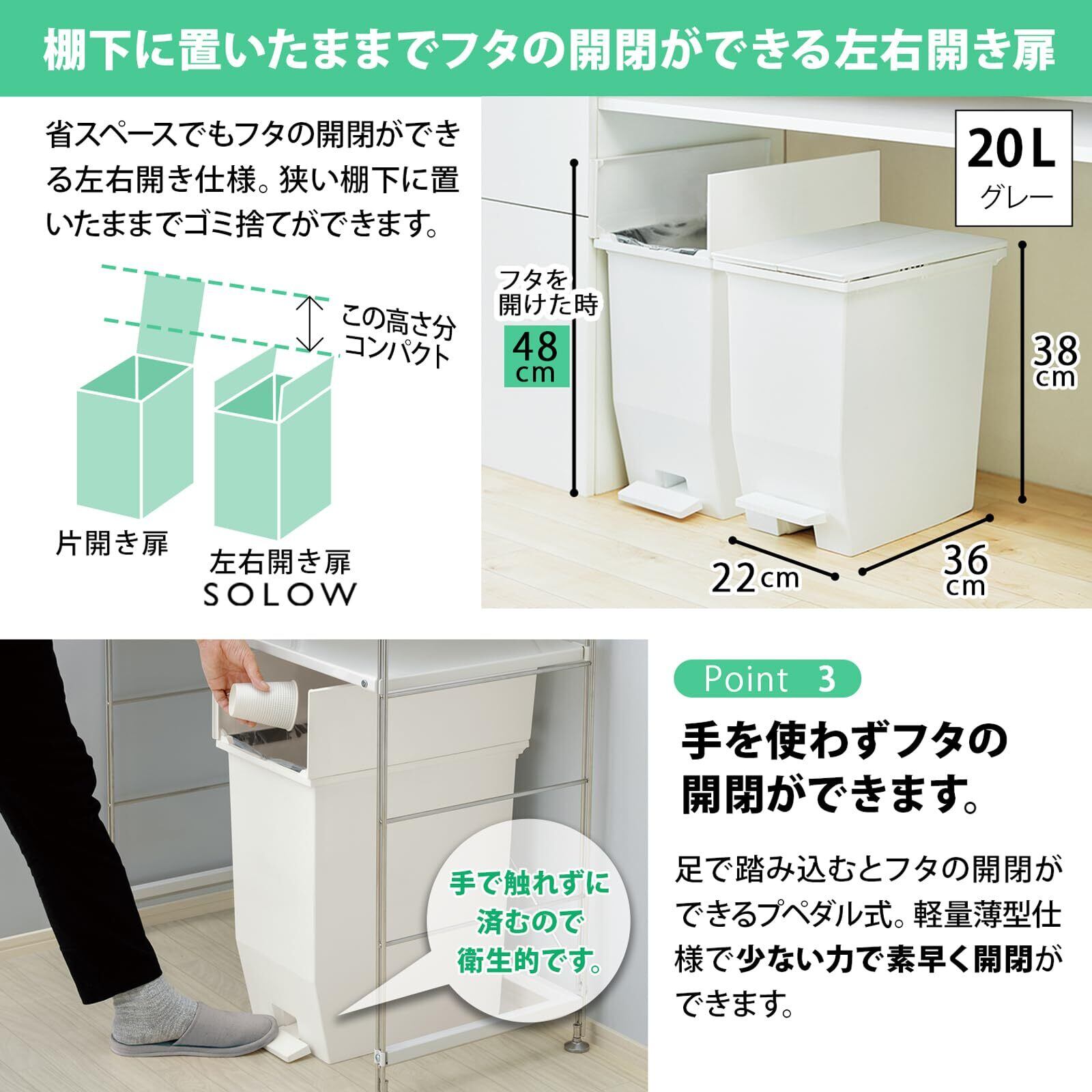 【在庫処分】【限定】リス(RISU) ソロウ ゴミ箱 ふた付き 20L グレー ペダルオープン 両開き 分別シール付き 抗菌 加工 日本製 おしゃれ キッチン 分別 スリム キャスター付き ダストボックス 186267