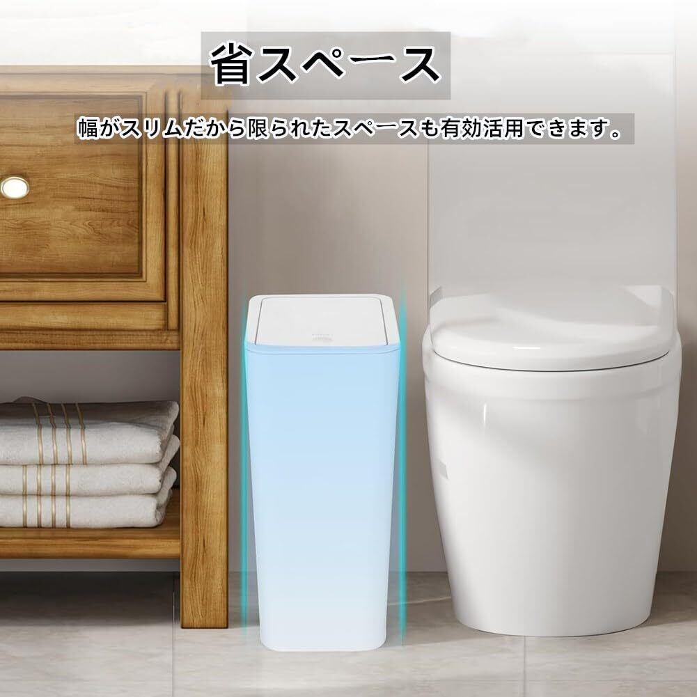 【スリムなデザイン】ちょっとした隙間に収まるスリムな蓋付きゴミ箱です。狭い隙間に収まり、小さなスペースを占有し、すべての小さなスペースを活用することができます。自宅のリビングやバスルームはもちろん、オフィスなどあらゆる場所に置いても馴染みやすいシンプルなデザインに仕上げました。