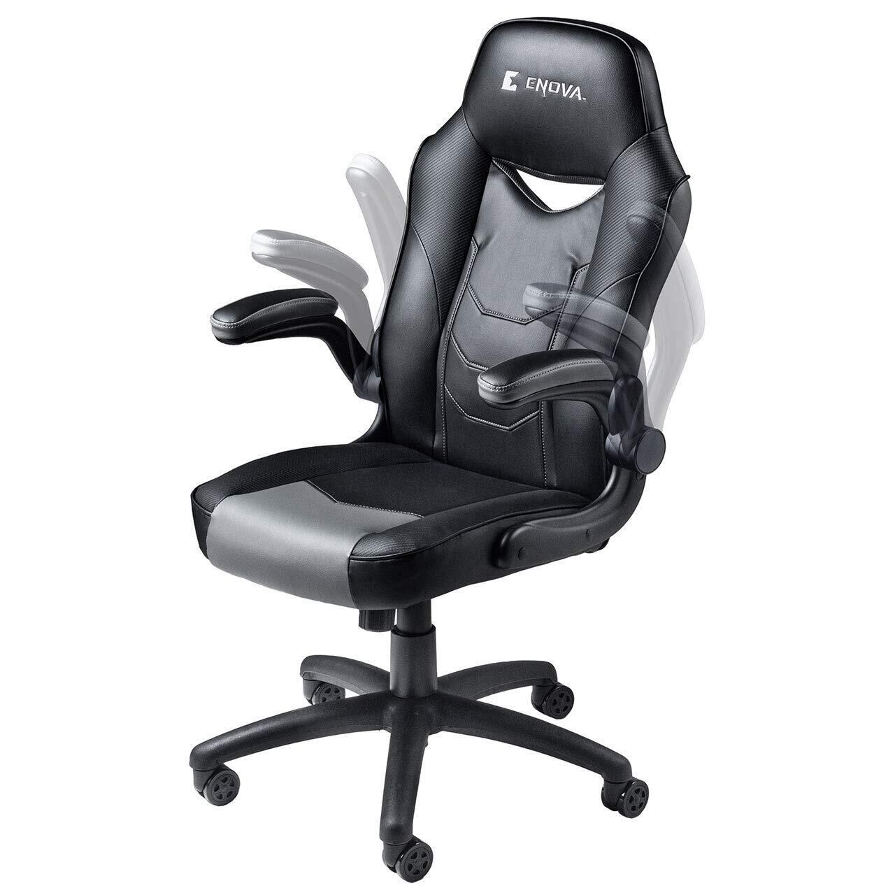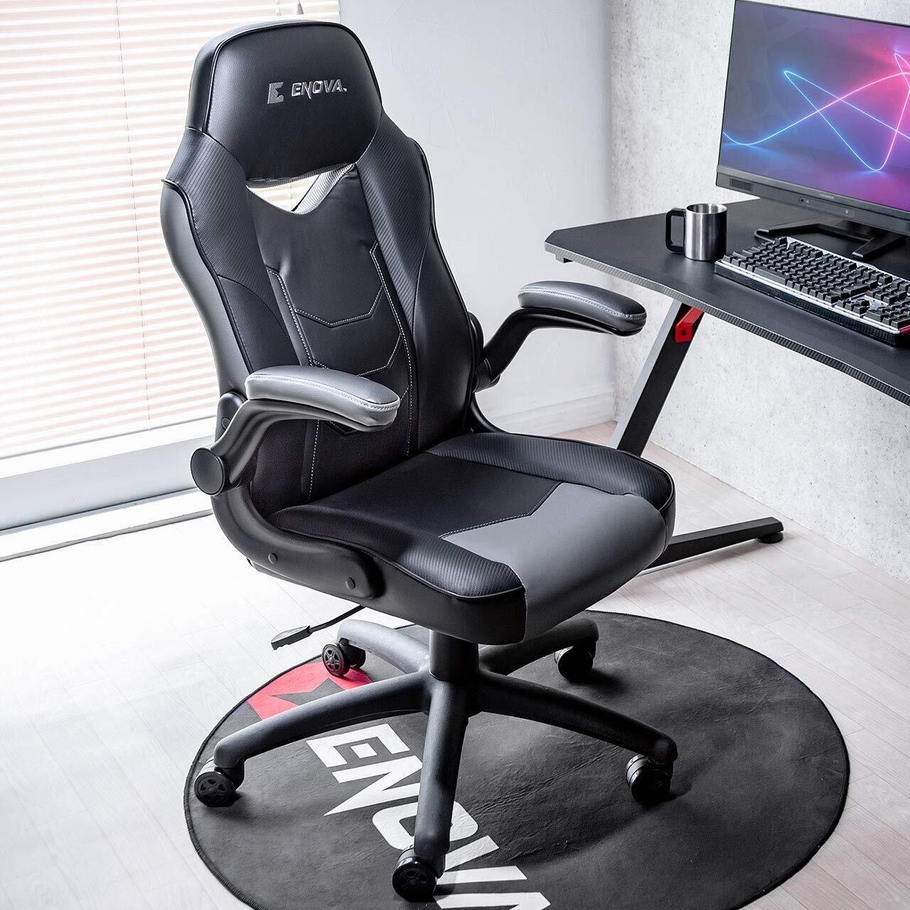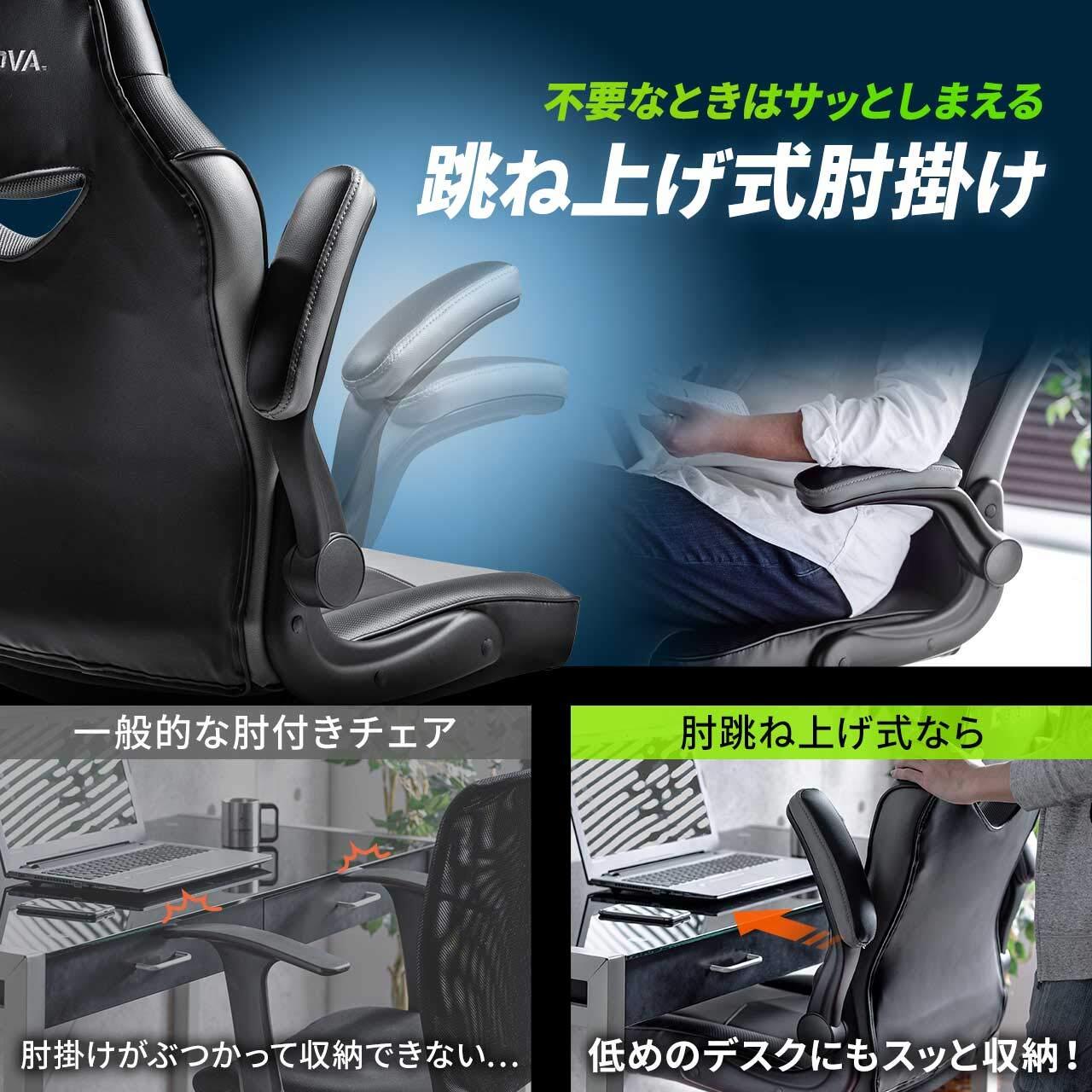 肘跳ね上げ式でゲーミングデスクなどにピッタリ収納できるゲーミングチェアです。背もたれはハイバック&バケットシート形状なので体を預けてもしっかりと支えてくれます。