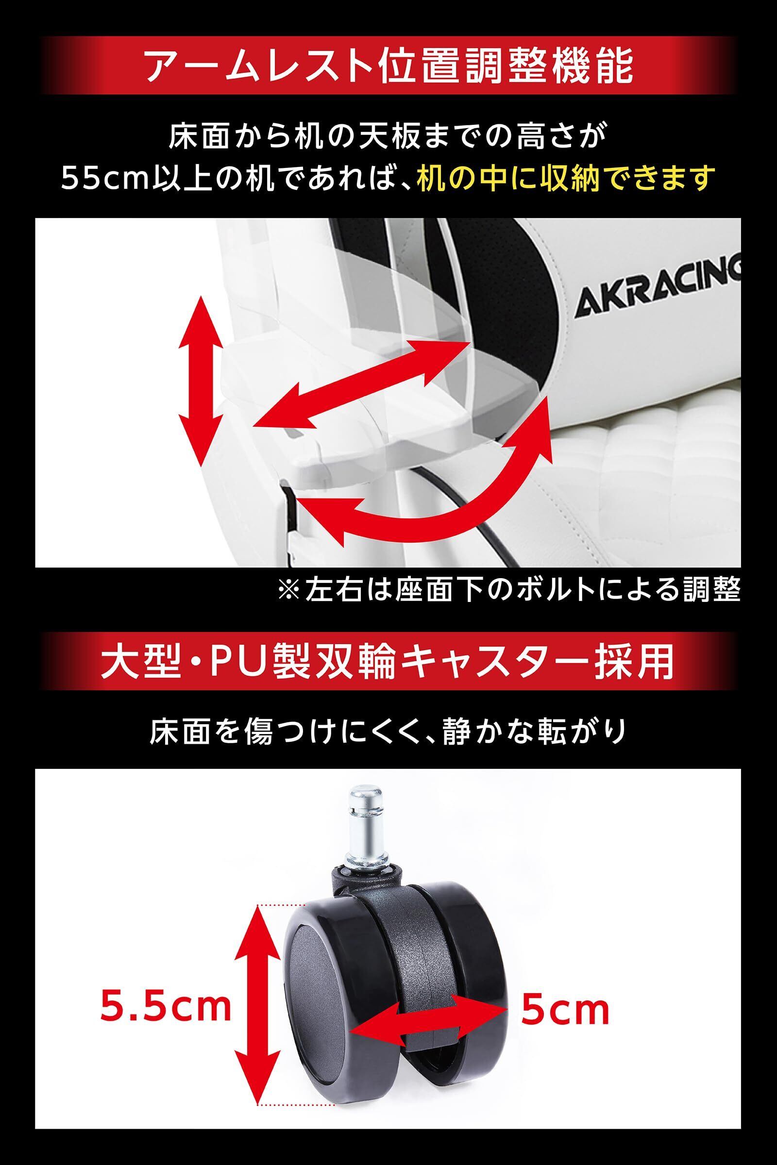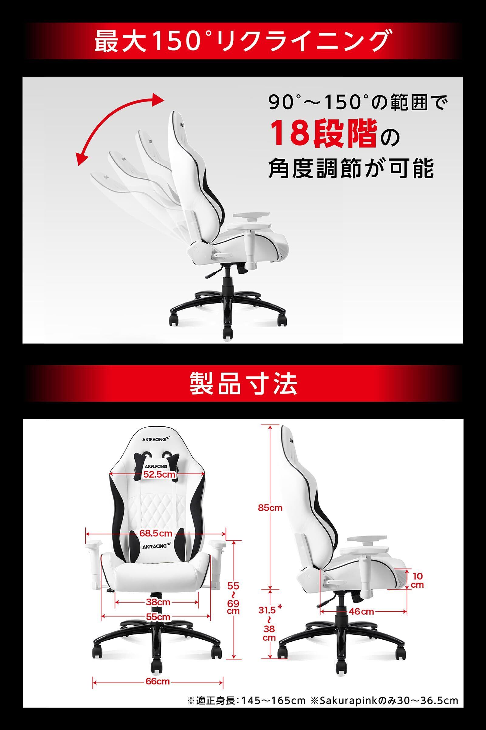 AKRacing Pinonシリーズは、AKRacingゲーミングチェアのティーン向けモデルです。スカイブルーは張地に肌触りと通気性の良いファブリック素材を使用し、サクラピンク、ホワイトは経年使用時の劣化に強い高耐久PUレザーを使用しています。適正身長:145~165cmに設計されており、若年層のユーザーはもちろん、小柄な女性にもお勧めです。取り外しが可能なランバーサポート/ヘッドレスト、最大150度リクライニング機構、床面を傷つけづらいPU素材双輪キャスターなど、AKRacingがこれまで培ってきた快適性と安心感に繋がるエッセンスが盛り込まれています。 移染しやすい衣類を着用して使用すると、薄色のPUレザーに対して移染が発生する場合があります。 移染しやすい衣類を着用して使用することはできるだけ避けてください。 PUレザーのお手入れ方法につきましては付属のマニュアルを参照してください。