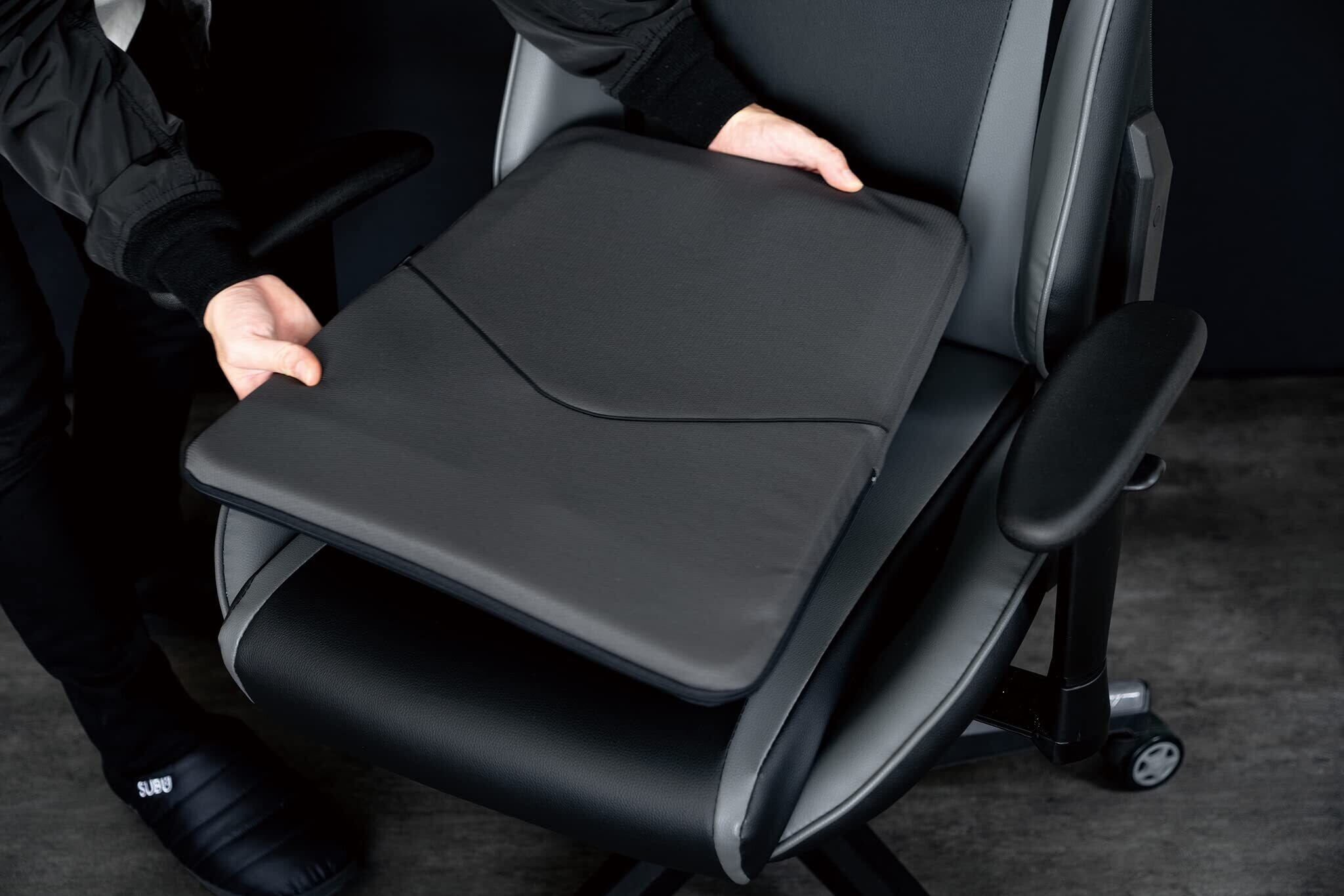 厚みは約2.7cmと薄くても底つき感が少なく快適。ゲーミングチェアの機能(ひじ掛け・ネックサポート)はそのままで、視点が変わらずにご使用いただけます。
