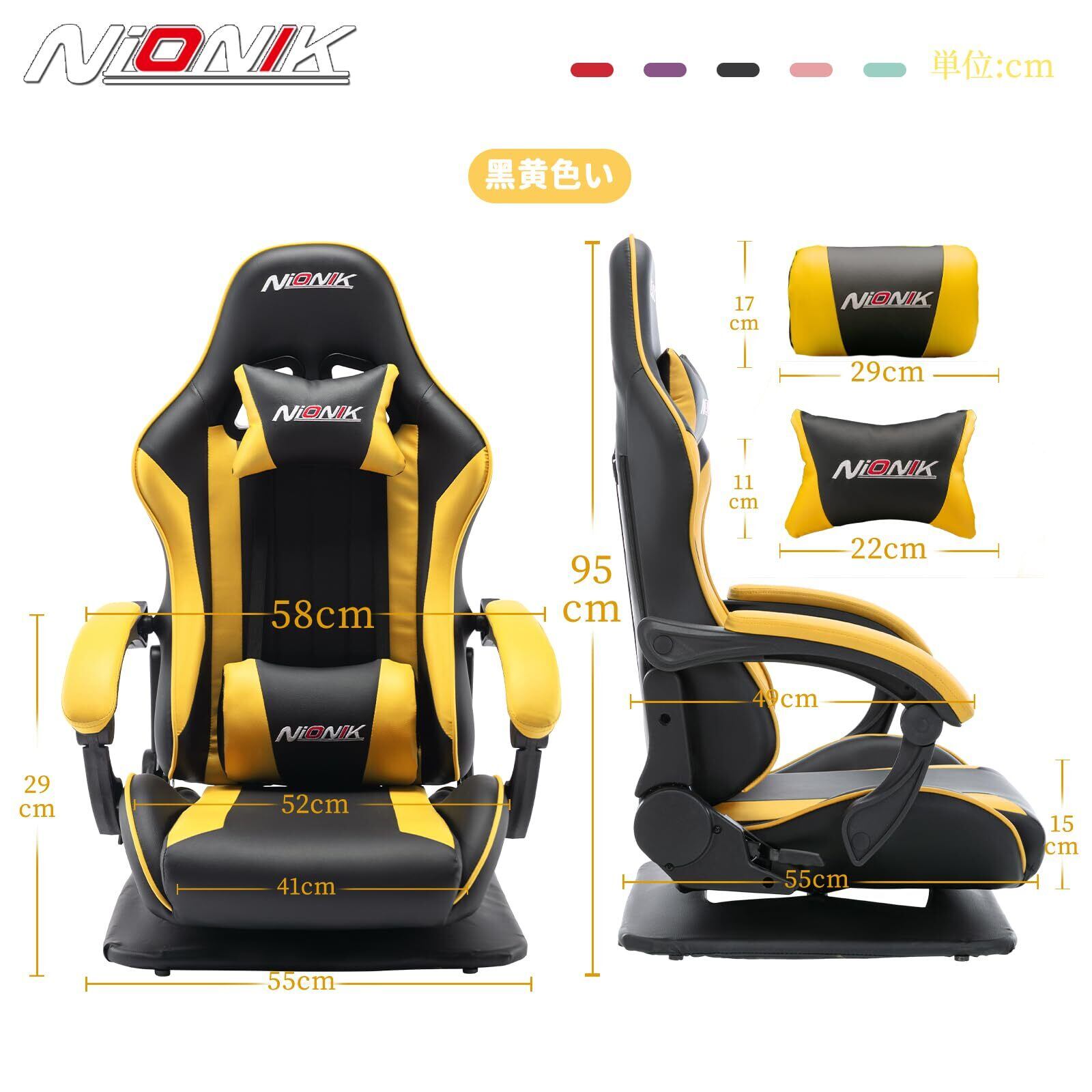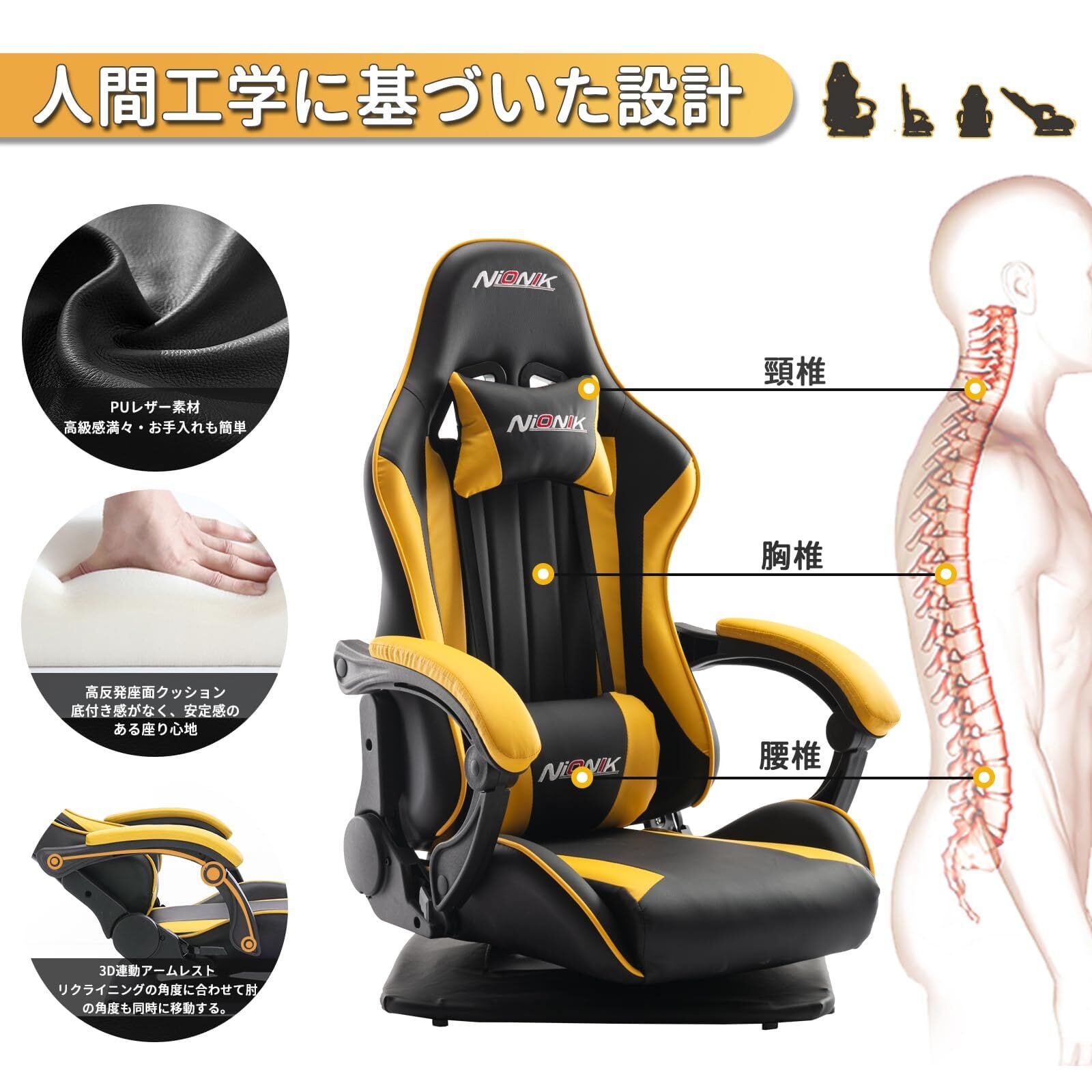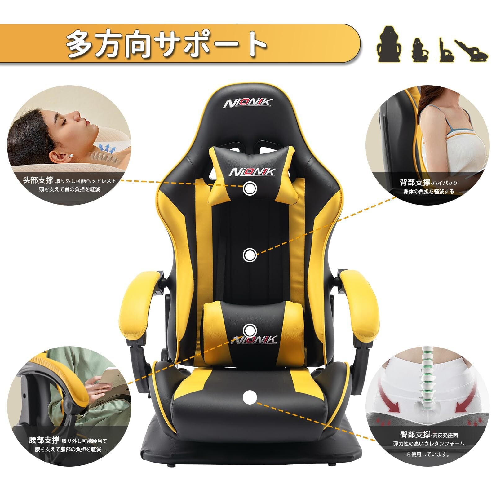 NIONIK ゲーミングチェア 座椅子 ゲーミング座椅子 180°リクライニング 回転座椅子 高反発 ハイバック 連動アームレスト ランバーサポート 360°回転座面 PUレザー 座椅子型ゲーミングチェア(イエロー)