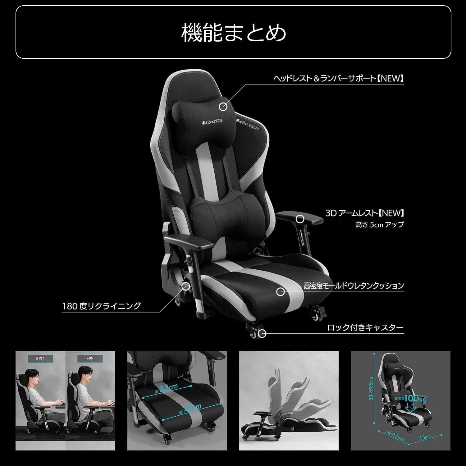 Bauhutte(バウヒュッテ) ゲーミング座椅子 GX-551-BK ファブリック リクライニング 3Dアームレスト ランバーサポート ロッキング機能 ブラック