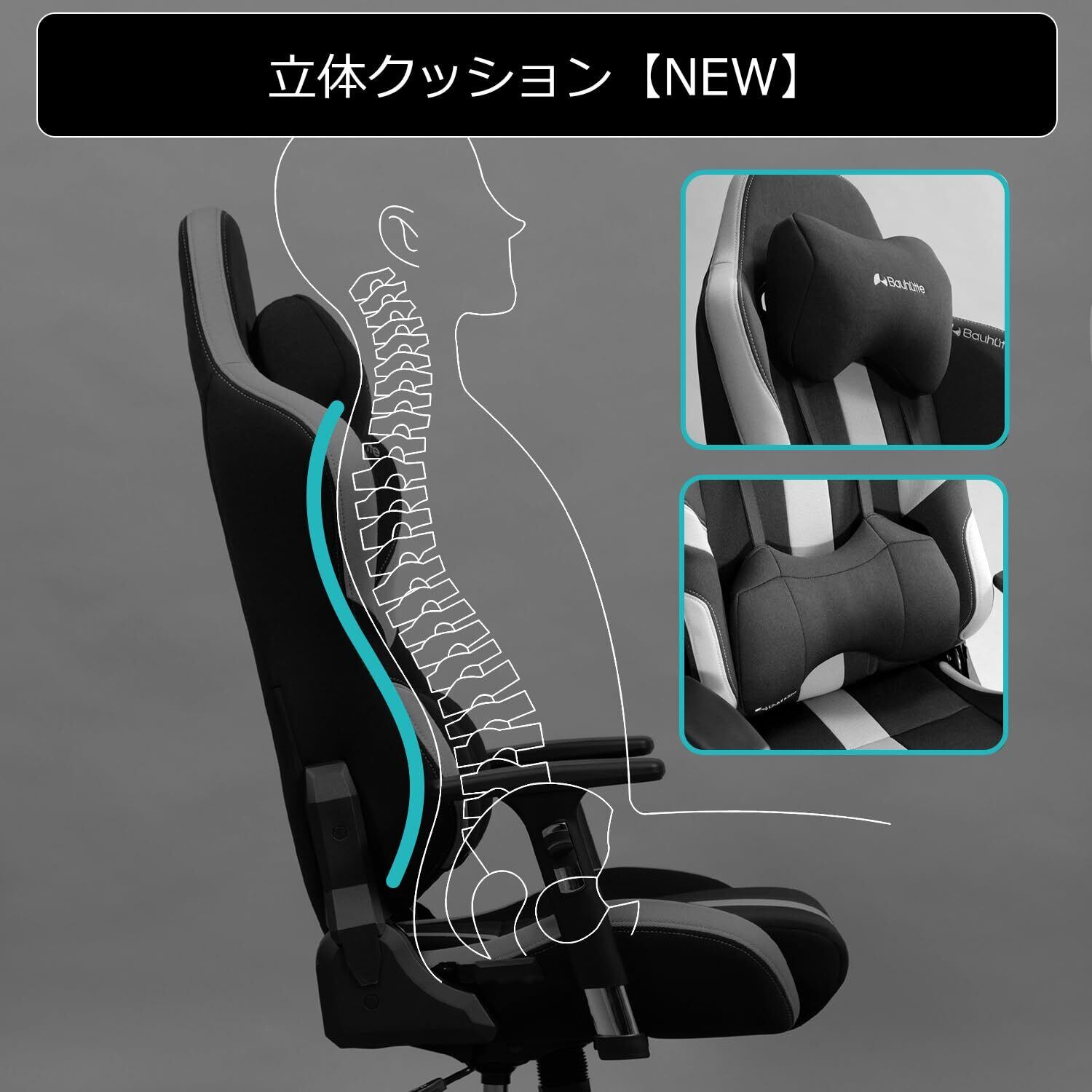 【立体クッション】首・腰を支えるヘッドレスト&ランバーサポートが付属。中材をウレタンからポリエステル綿に変更したことで、通気性・弾力性を向上。背中のS字ラインにフィットして正しい座り姿勢を補助します。