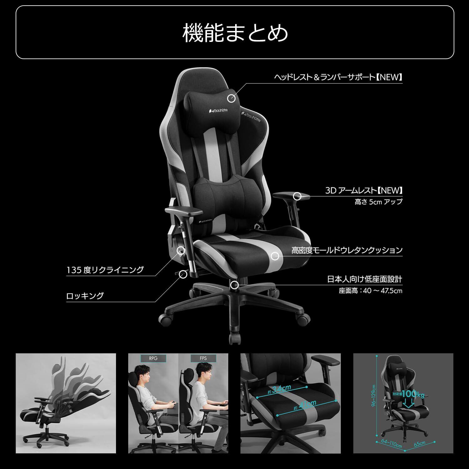Bauhutte ( バウヒュッテ )ゲーミングチェア 日本人向け低座面設計 デスクの高さに揃う 高めのアームレスト 姿勢を支える大型クッション ファブリック リクライニング 3Dアームレスト ランバーサポート ブラック G-551-BK