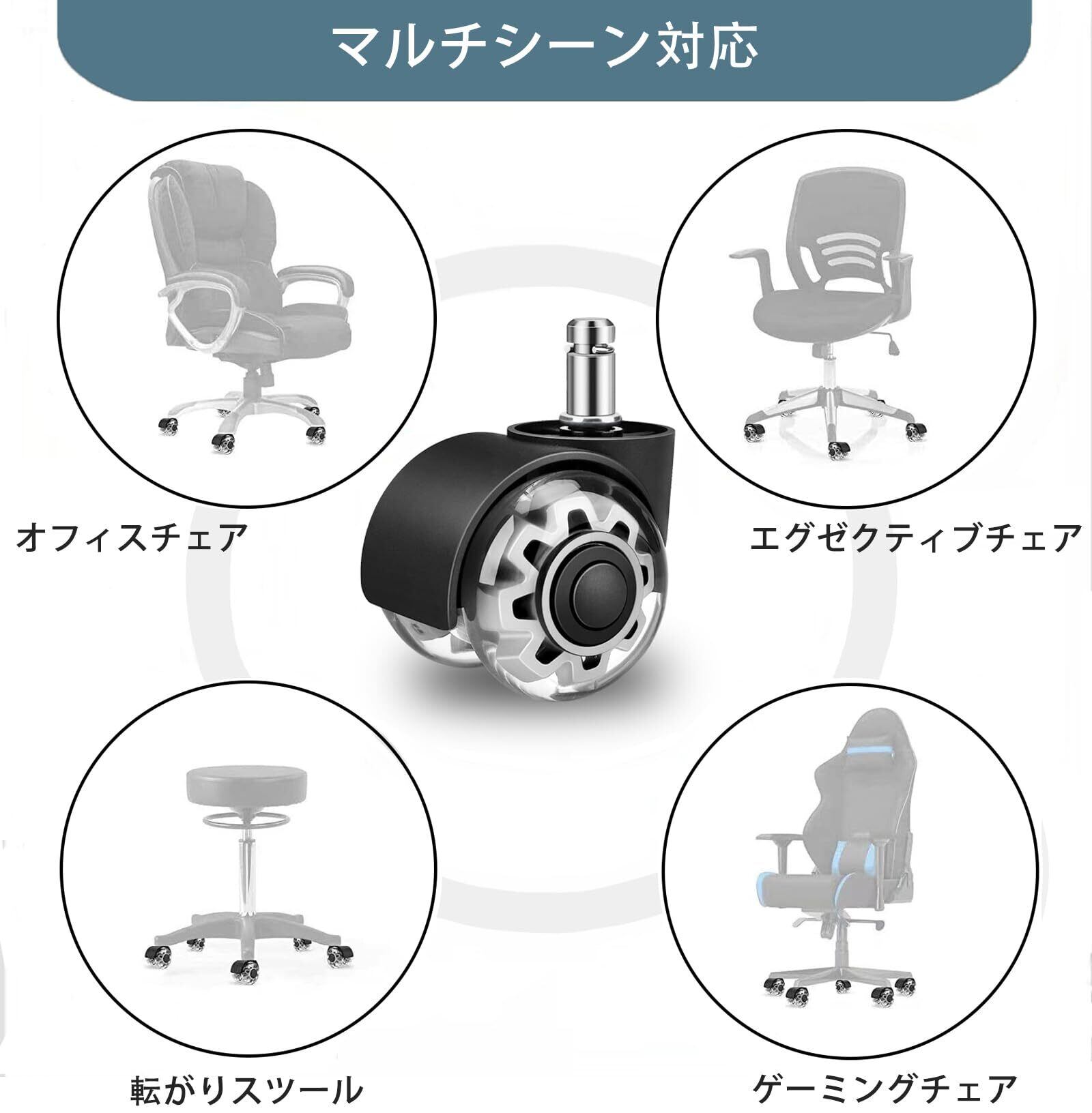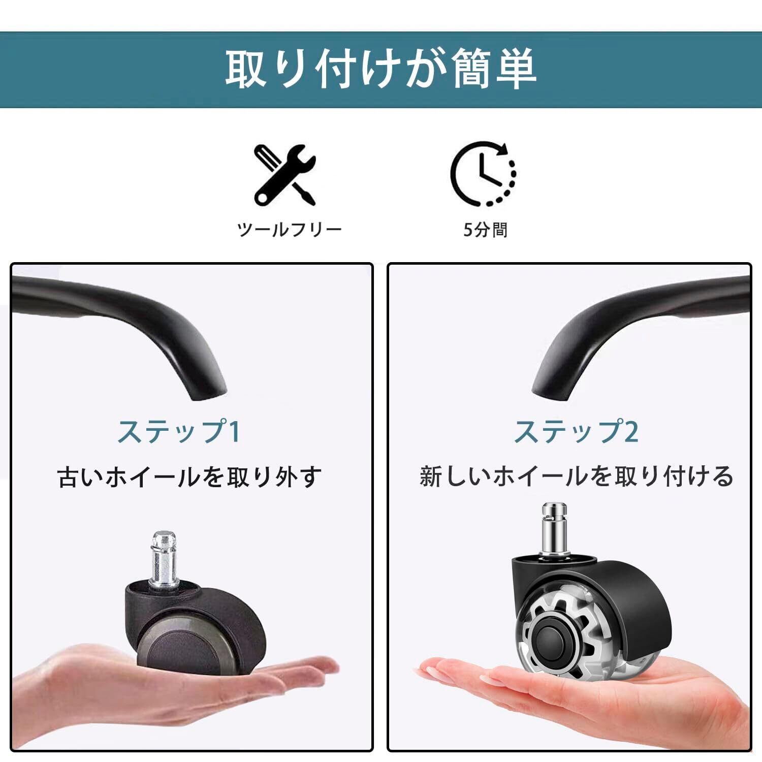 【取り付けが簡単】取り付けは工具なしで手動で行うことができます。 古いオフィスチェアのキャスターを取り外し、新しい交換用オフィスチェアのキャスターを差し込むだけで取り付け完了です。 わずか5分で、あなたの椅子が真新しく見えるので、電話をしている間に取り付けることもできます。