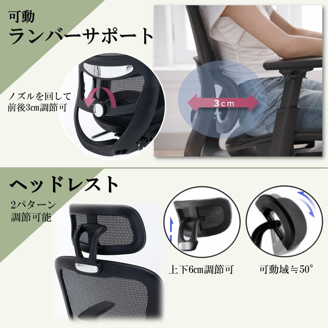 【機能】長時間の作業をサポートする機能を多数搭載。リクライニング、ロッキング機能、調整可能の腰が楽になるランバーサポート、腕をサポートするアームレスト、フットレスト・ヘッドレスト付き。