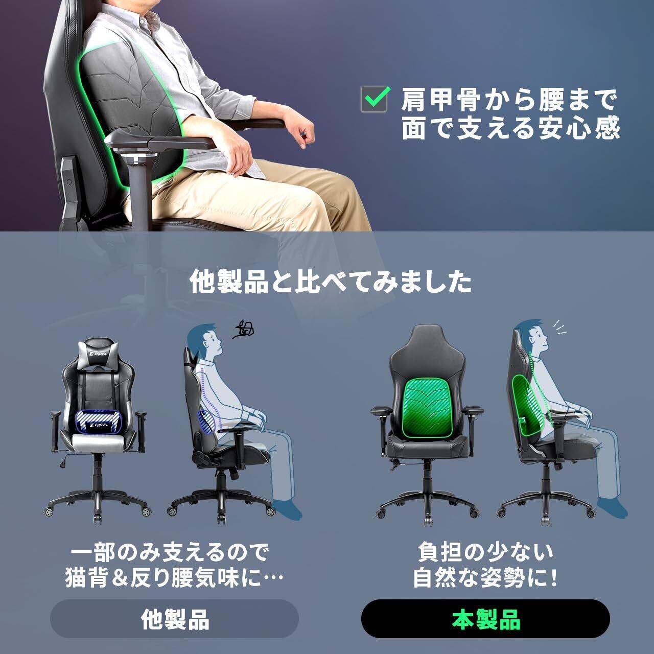 大きめで背中全体を押し出す ランバーサポート は、肩甲骨から腰まで面で支えます。