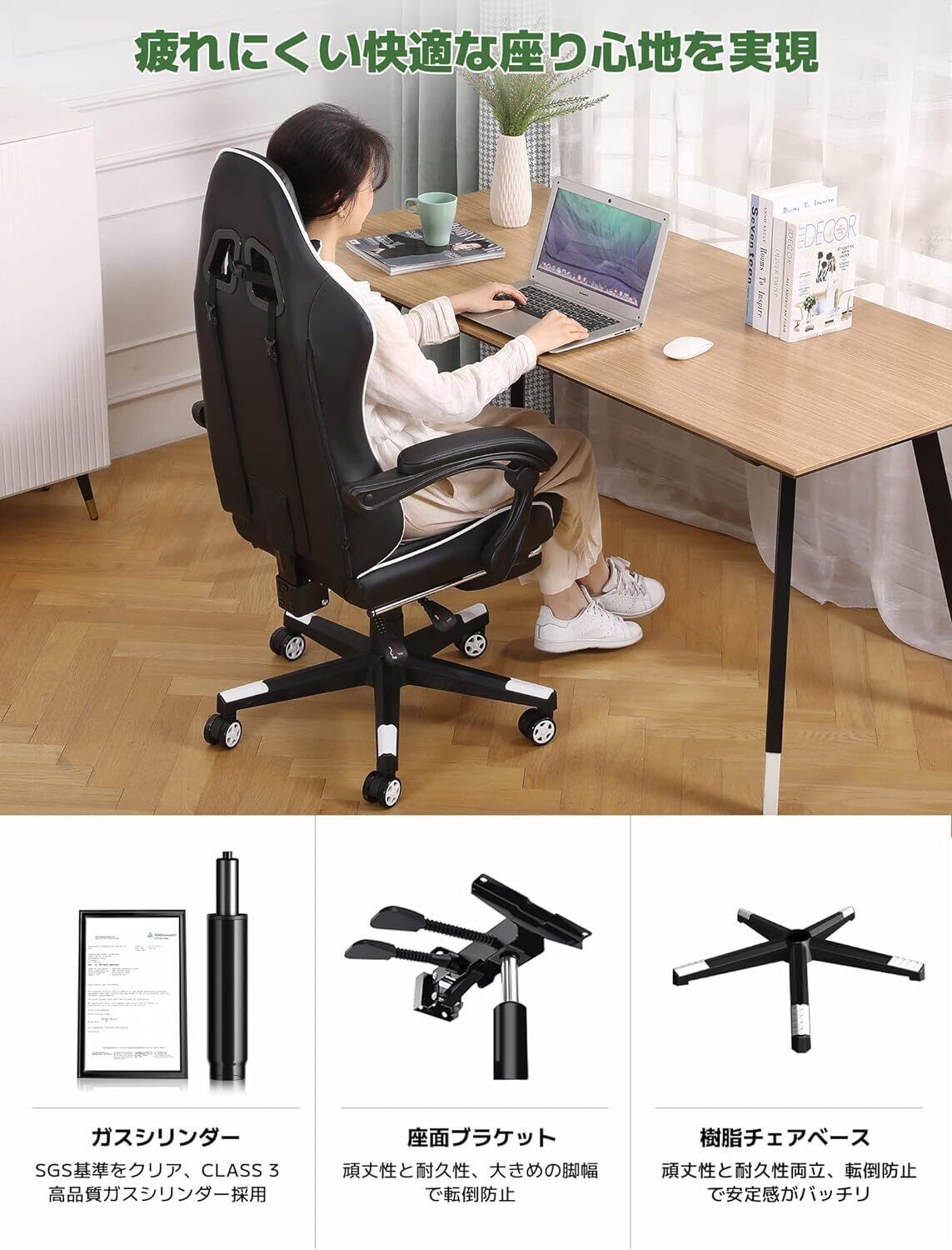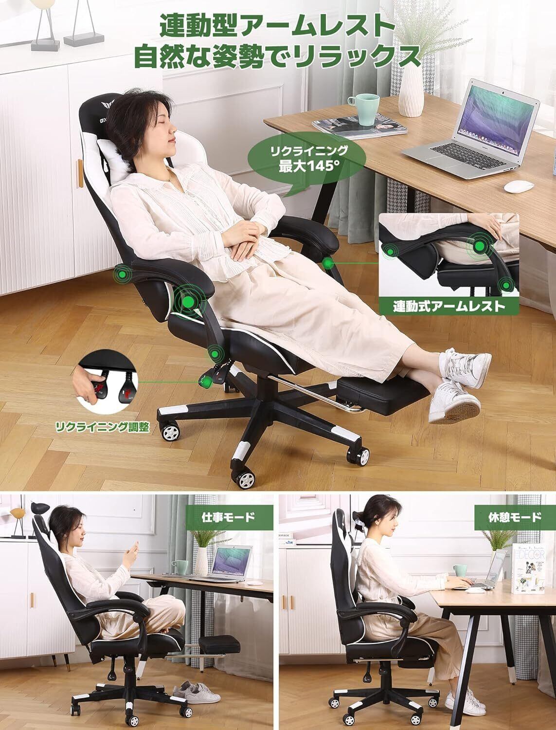 【多機能を備えたゲームチェア】フル装備の多機能ゲーミングチェア、連動型アームレストにより、リクライニングと背もたれの角度に連動し、どんな角度でも手や肘を完全サポートできます。スマートフォンや漫画鑑賞などの時に、優しく腕を支えてくれます。肘パットにクッション付き、長時間腕を置いても、痛みなし快適なデスク作業を行えます。日本人の体格にあわせて椅子の高さが約8cm調整可能。平均的な身長の方はもちろん、小柄な方にも使いやすいです(推奨身長:145~185cm)。科学的安全な145°角度調節機能、後転防止、老人と子供にも適しています。リクライニング機能ついて、90°~145°まで後ろに倒れ、オットマンと組み合わせればリラックス効果抜群です!