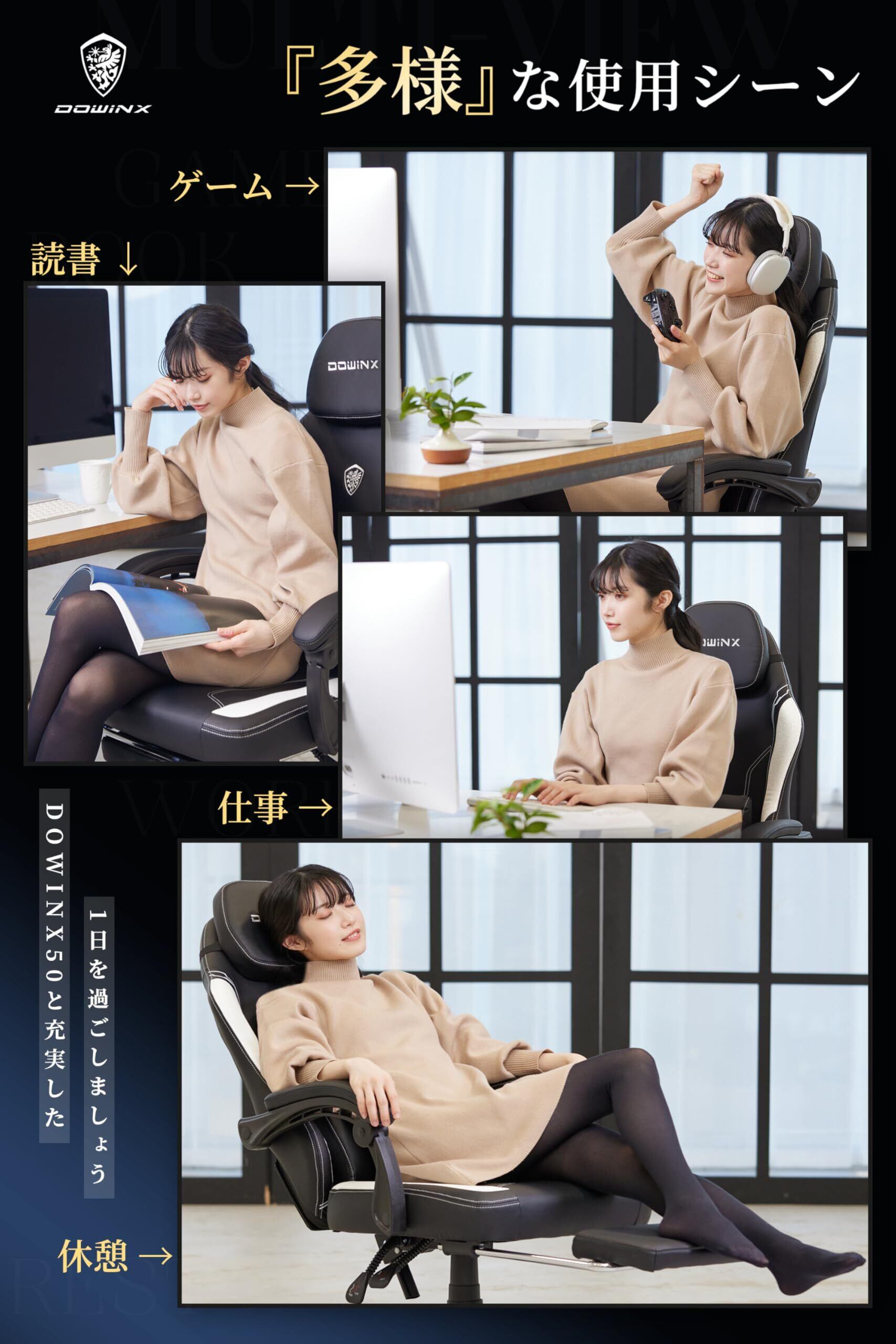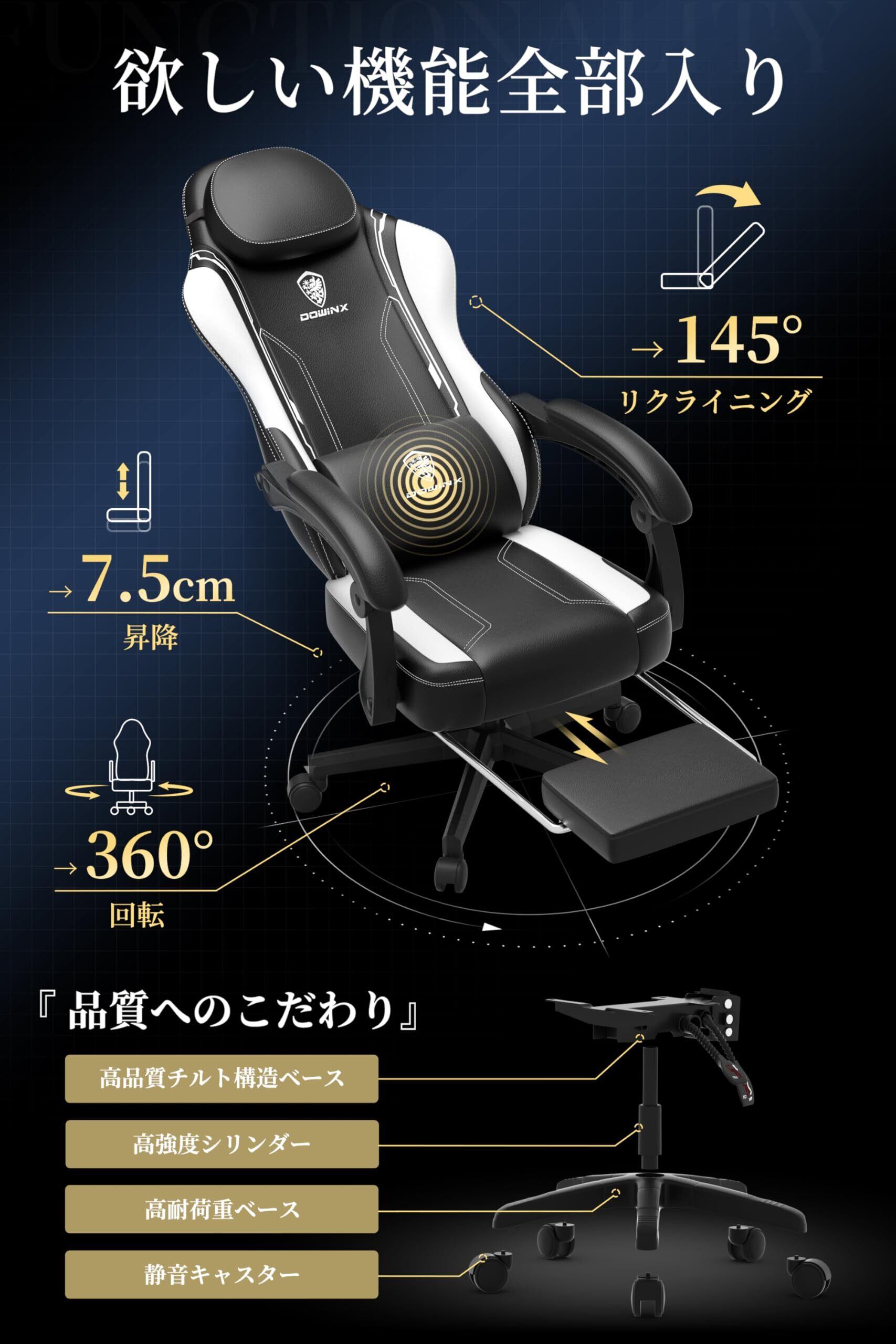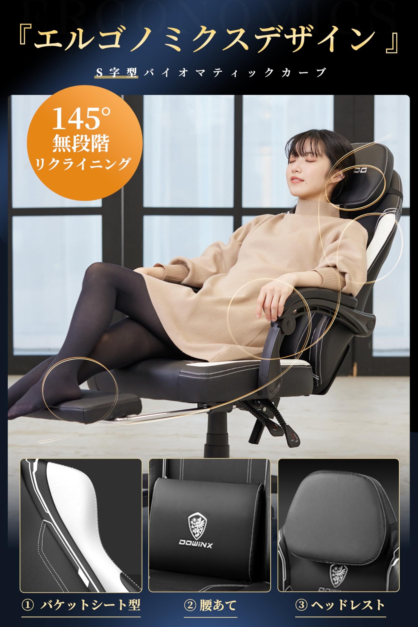 Dowinx ゲーミングチェア イス オフィスチェア 幅広座面 デスクチェア オットマン付 椅子 ゲーム用 145°リクライニング ポケットコイル 疲れない パソコンチェア PUレザー ソファー座り心地 テレワーク PCチェア 在宅 リモート 収納 人間工学の王道 おしゃれ ブラック&ホワイト