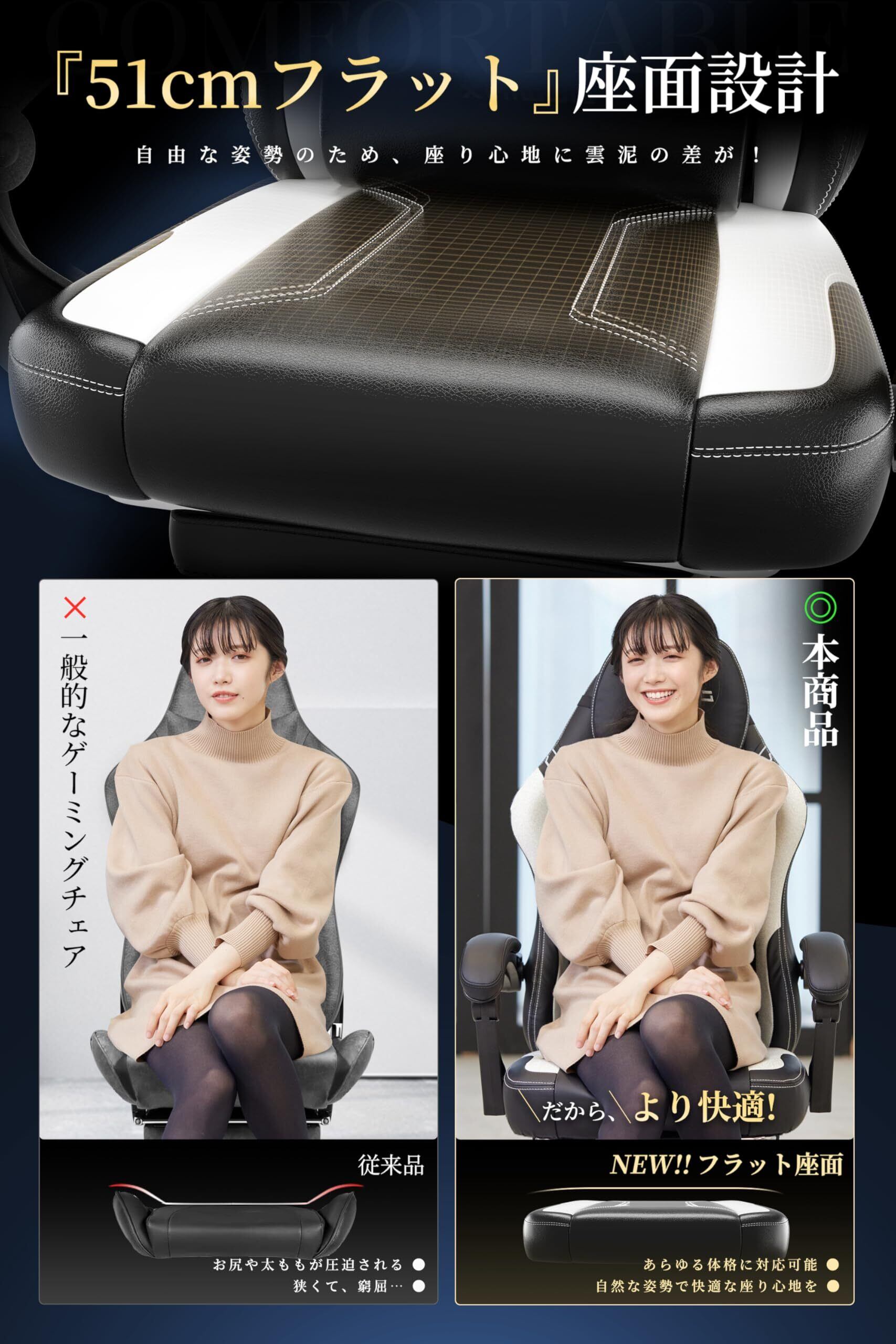 【幅広シートとS字型人間工学構造】約30%拡大した斬新なフラットシート設計を採用!広い座面クッションはお尻・太ももへの負荷がかかりにくく、自由な姿勢で作業に集中できます。エルゴノミクスによるS字型人間工学構造により、首・腰への負担を軽減します。アップグレードヘッドレストと腰当ては、脊柱システム全体にサポートを提供します。