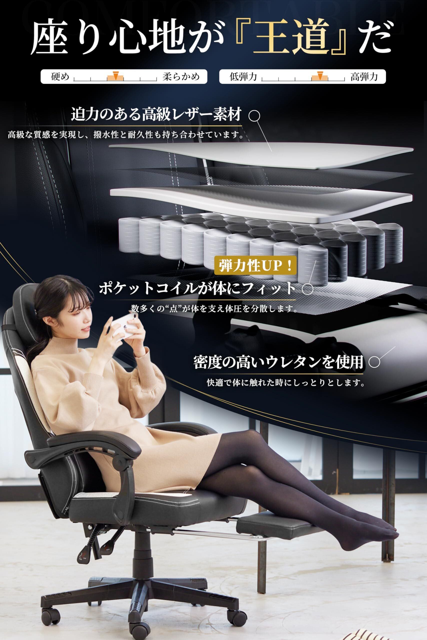 【体にフィットする高級ソファーの座り心地】密度の高いウレタンと体によくフィットできるポケットコイルを採用し、ソファーのようにお尻を優しく包み込み、長時間のテレワークや在宅ワークでも疲れにくい。高級感漂うレザー素材は通気性に優れ、撥水性と耐久性も持ち合わせています。