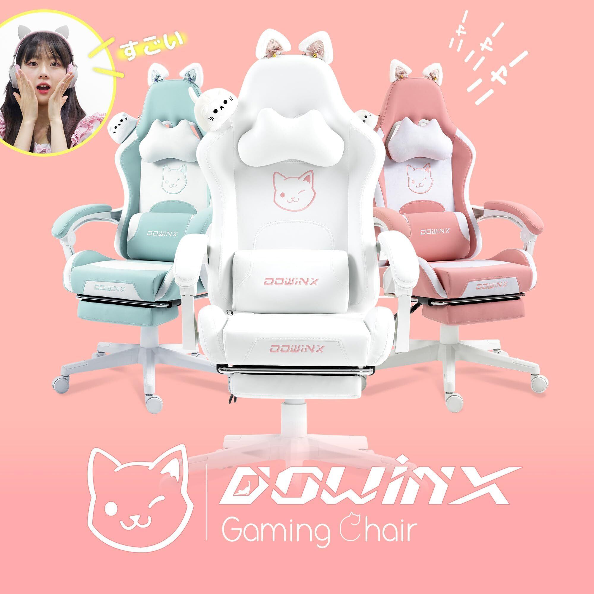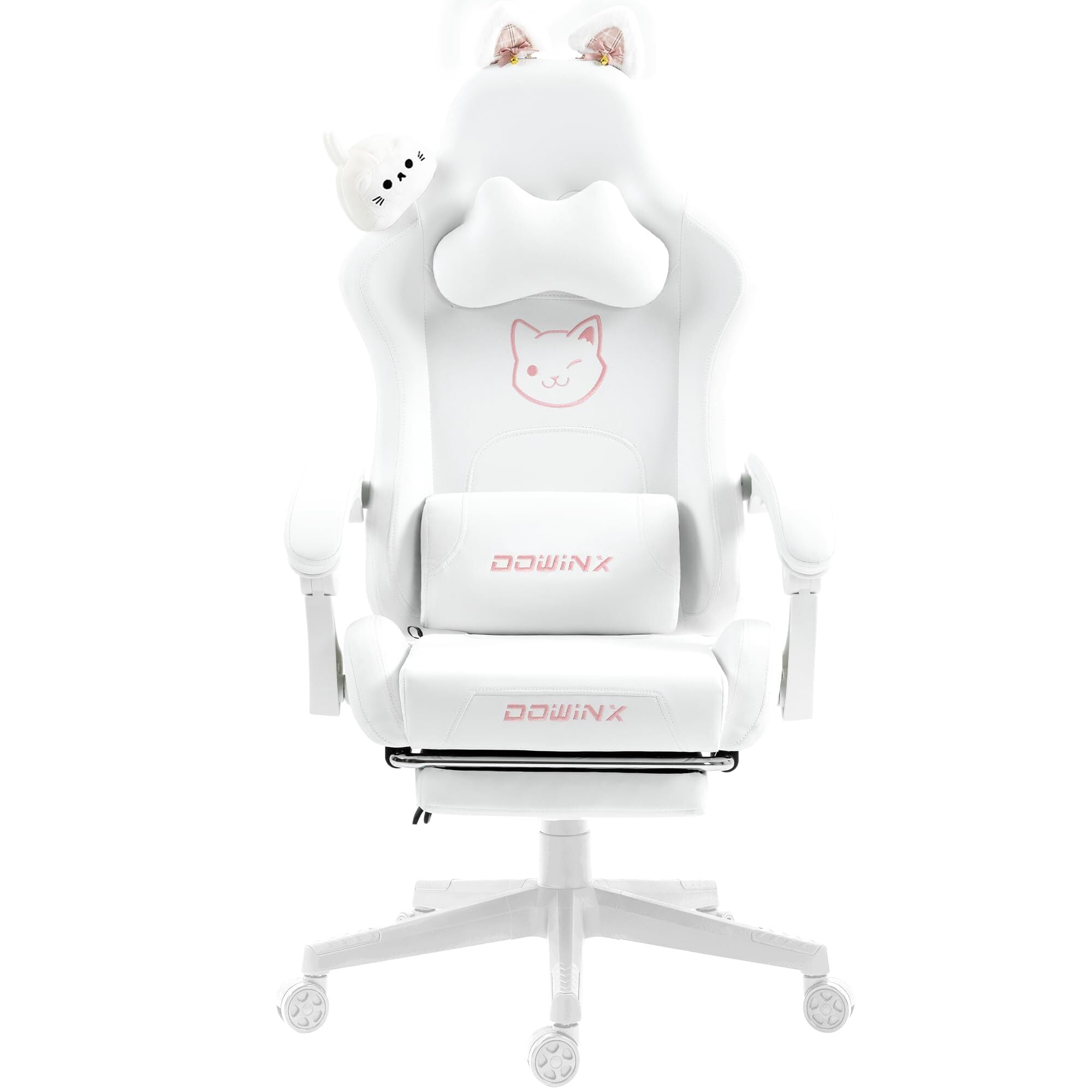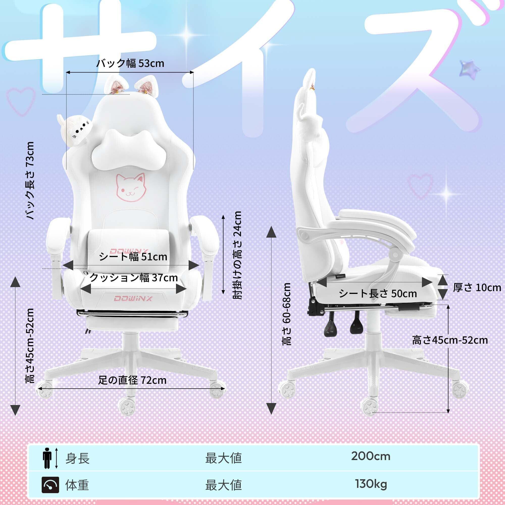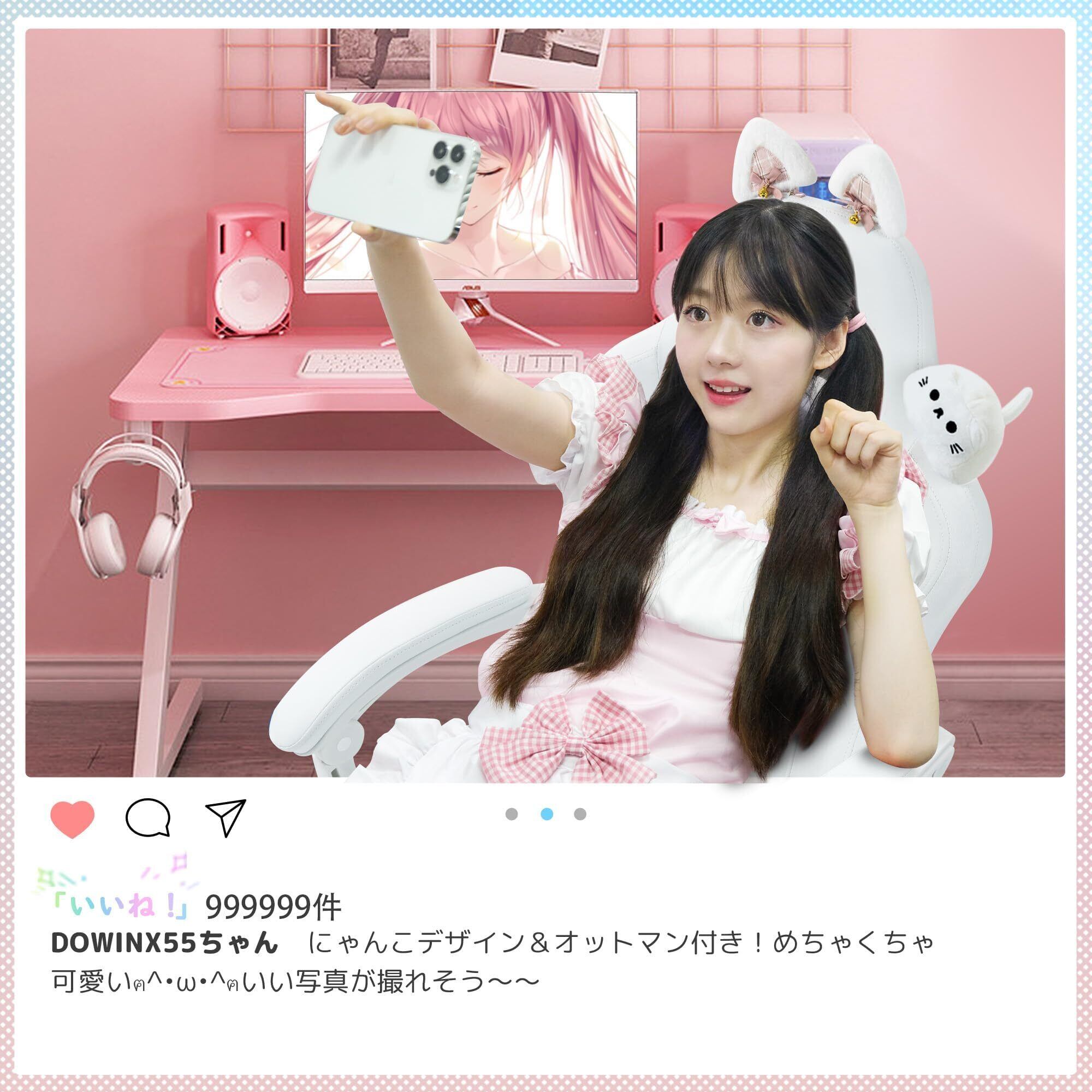Dowinx ゲーミングチェア 白 可愛い かわいい にゃんこ 猫耳 ヘアピン 鈴付き 猫柄 pc/オフィスチェア ゲーム用 パソコンチェア 幅広 通気性 リクライニング ハイバック 昇降アームレスト PUレザー LS-665501