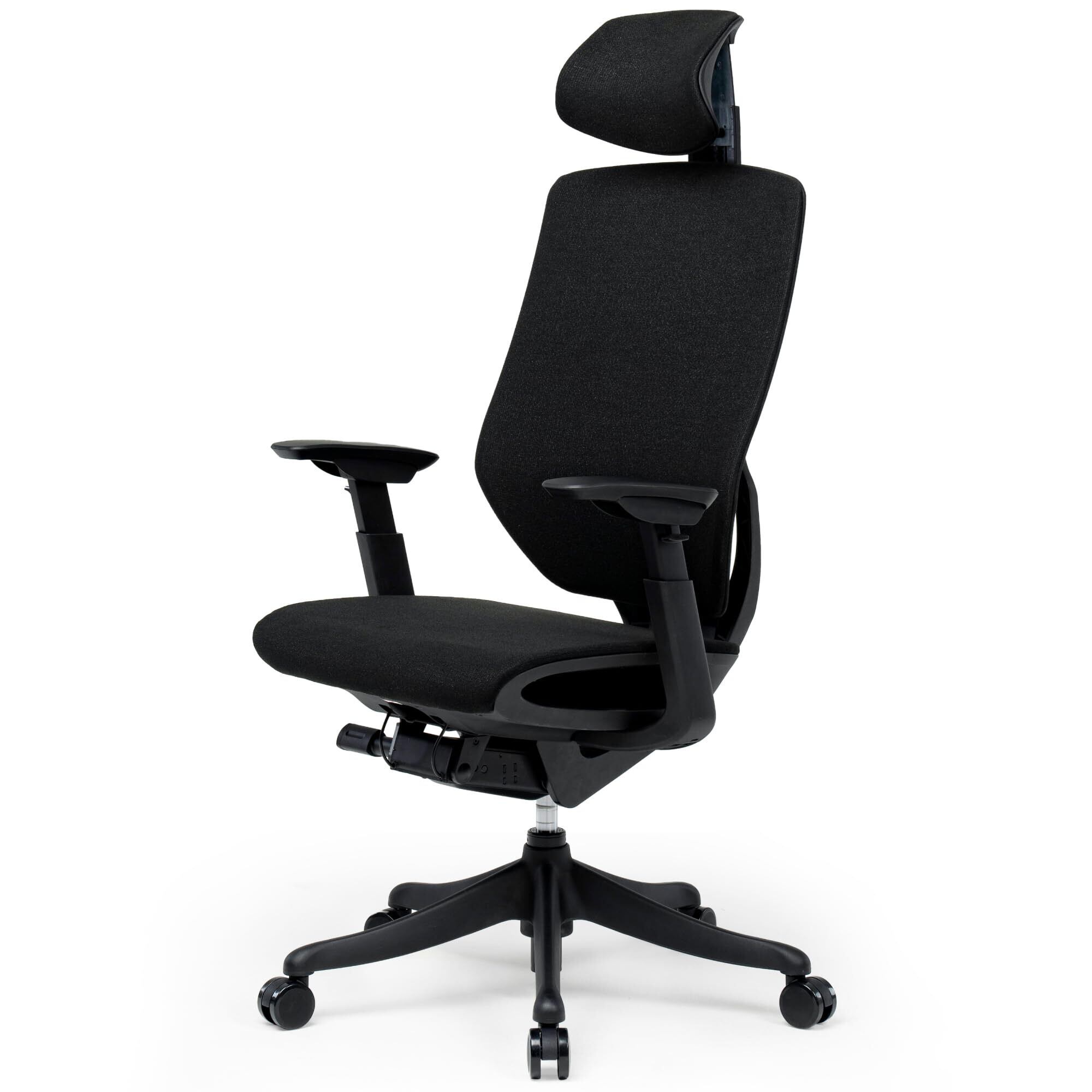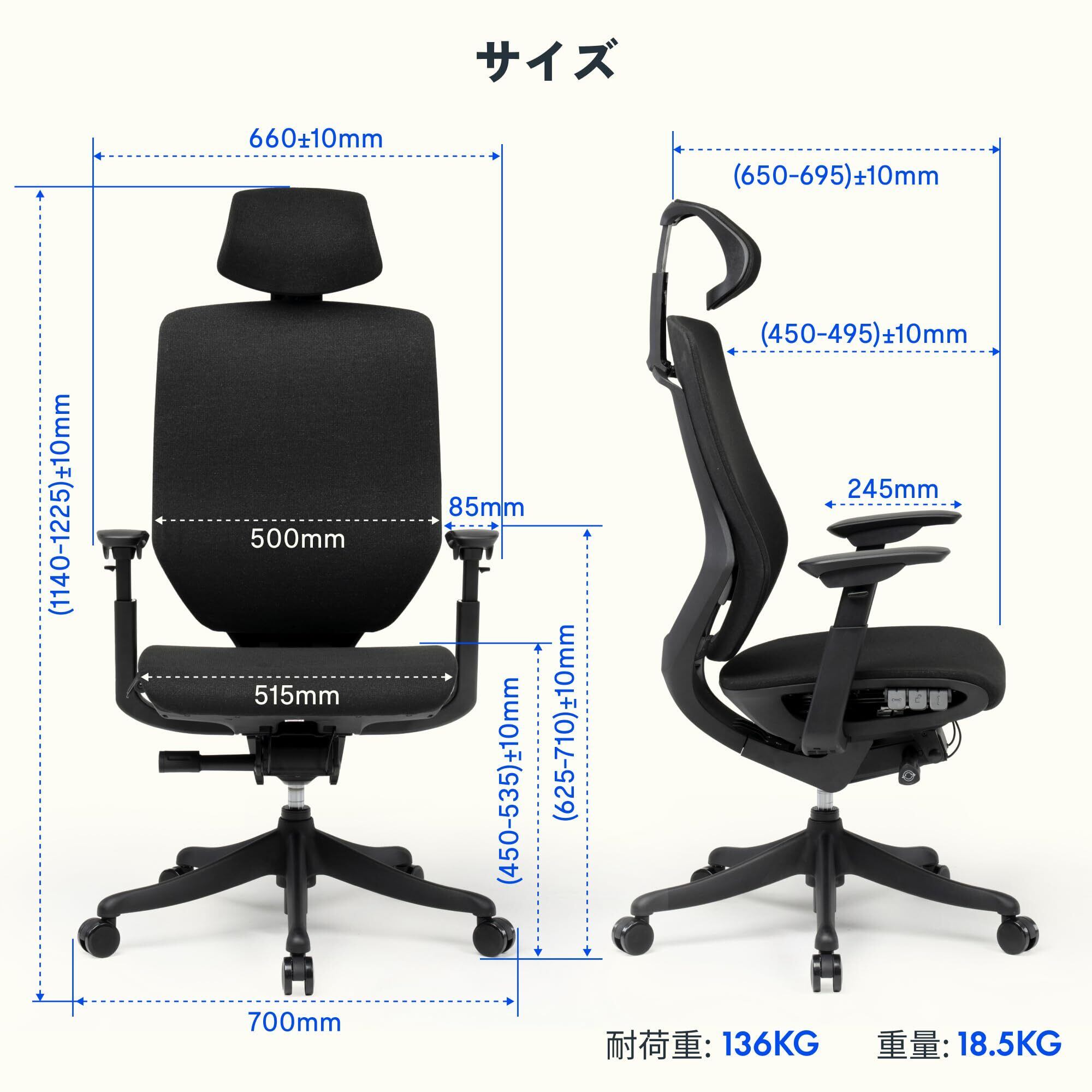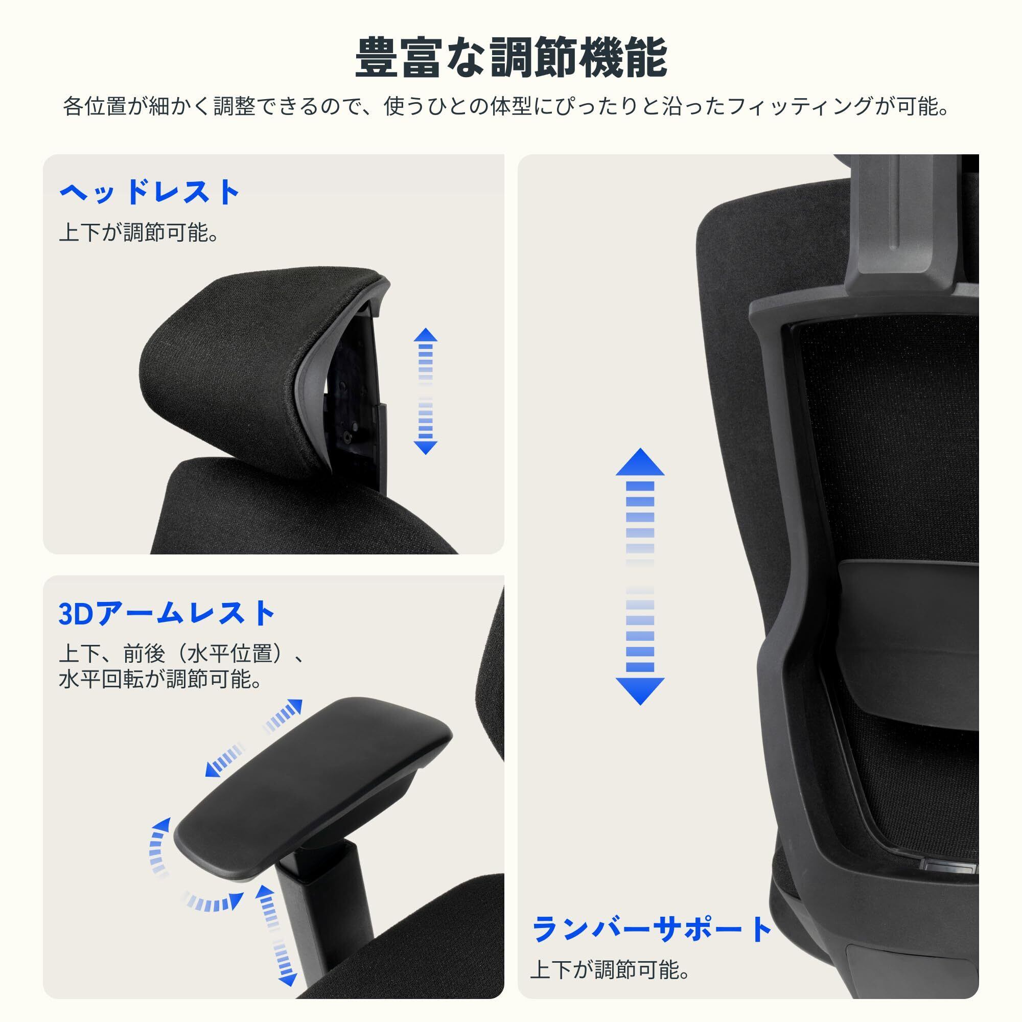 【豊富な調節機能】各位置が細かく調整できるので、使うひとの体型にぴったりと沿ったフィッティングが可能。◎3Dアームレスト:上下、前後(水平位置)、水平回転が調節可能。 ◎ヘッドレスト:上下が調節可能。 ◎ランバーサポート:上下が調節可能。