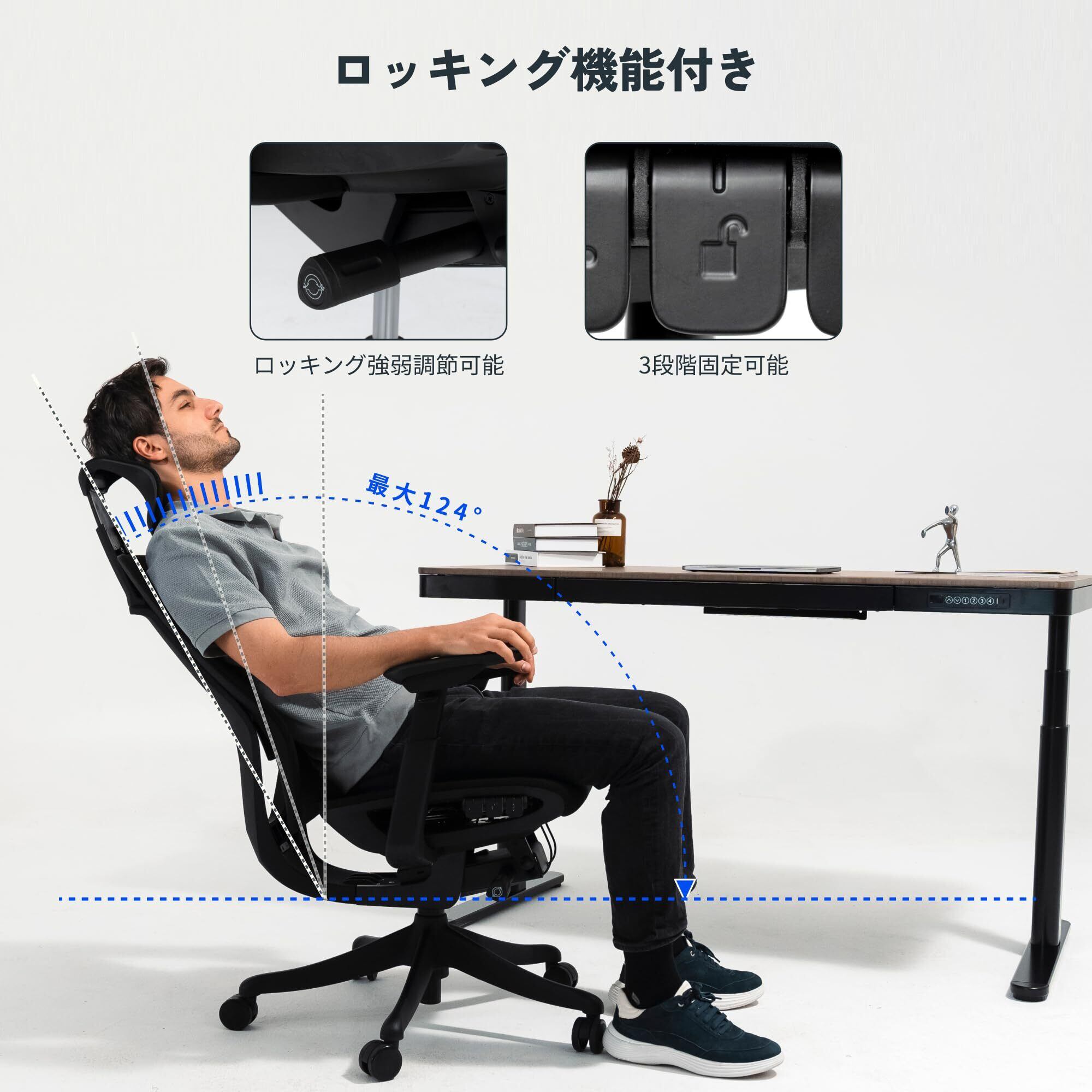 【座面の右下にあるボタンだけで簡単操作】◎座⾯の⾼さ調節:45cm-53.5cm ◎座面の奥行き調節:4.5cm ◎ロッキング機能付き・3段階固定可能・ロッキング強弱調節可能:ボタンを押し上げるとリクライニングを3段階で固定でき、ボタンを押し下げると固定が解除され、124度までロッキング可能。