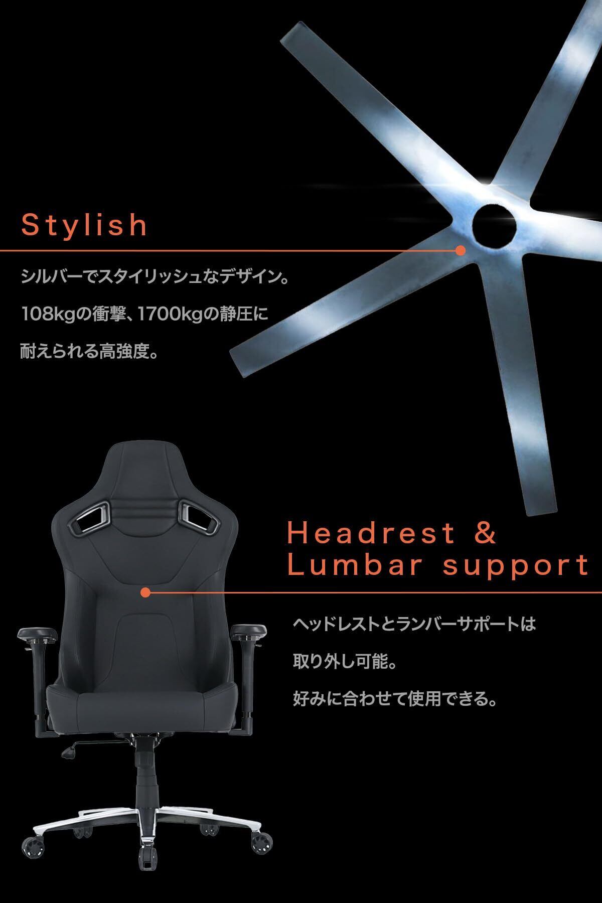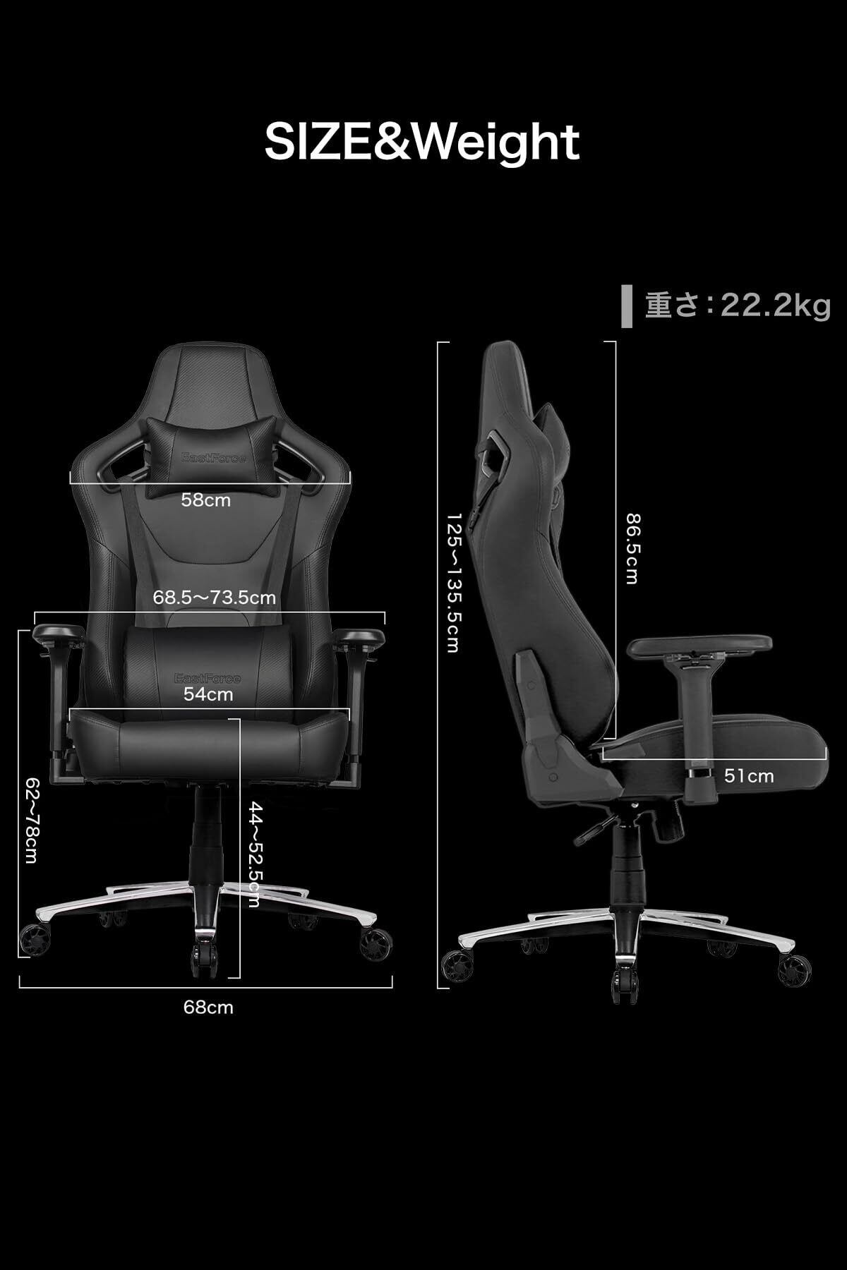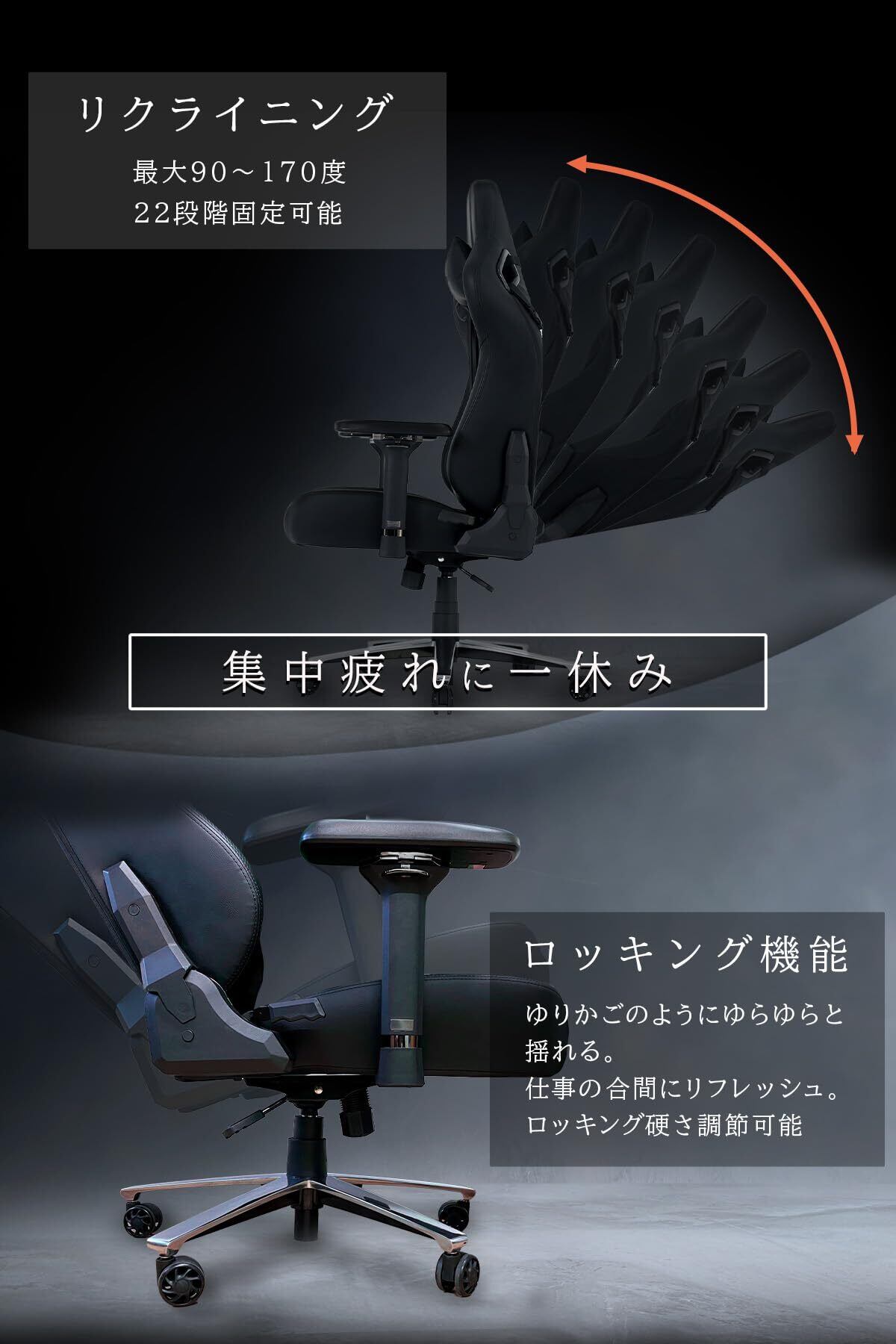 【充実した多機能】① 「最大160度まで倒せるリクライニング」リクライニング最大90~160度、22段階固定可能。簡単なレバー操作だけで貴方の求める角度へ調整でき、最高の休息をお届けします。 ②「高品質4Dアームレスト」昇降7㎝(7段階) 、3段階角度調節(左、正面、右)、前後スライド幅3.5㎝(5段階スライド) 、左右スライド幅3㎝(5段階スライド)でき、より楽な姿勢で ゲーム ・ 仕事 で最適なポジションに調整可能。 ③「ロッキング機能付き」ゆりかごのようにゆらゆらと揺らす事ができ仕事の合間にリフレッシュ、ロッキング硬さ調節可能。④「調節可能ランバーサポート」お好みの位置にランバーサポート調節可能。程よい硬さでしっかりと S字 をサポート