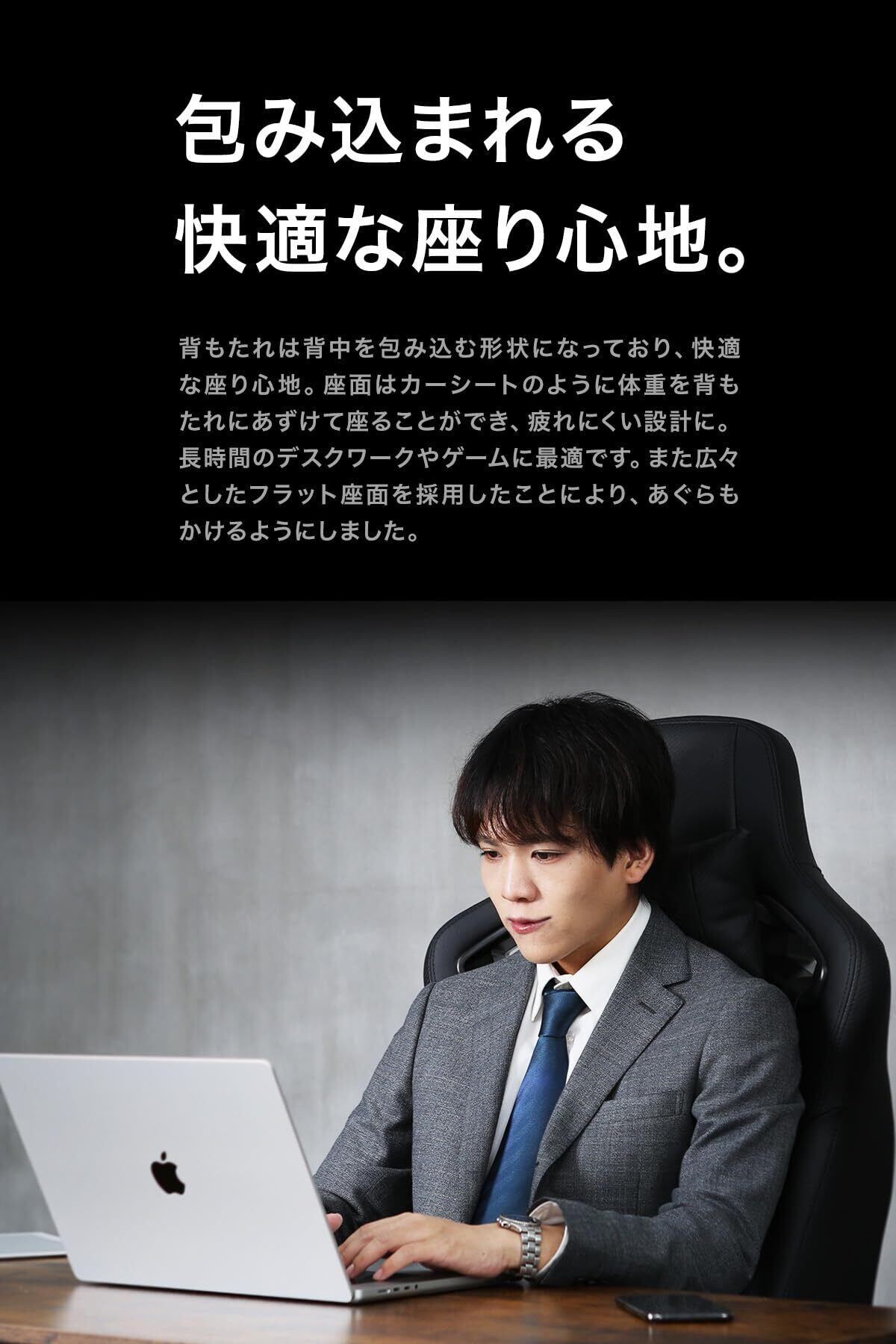 【上質な座り心地】①「疲れにくい設計」背もたれは背中を包み込む形状になっており、快適な座り心地。 座面はカーシートのように体重を背もたれにあずけて座ることができ、疲れにくい設計になっております。長時間のデスクワークやゲームに最適です。②「広々とした肉厚座面」厚み10㎝、幅54㎝、肉厚10㎝高密度モールドウレタンで、高級マットレスに匹敵する密度50D。圧迫感の少ない幅広座面であぐらもかける。