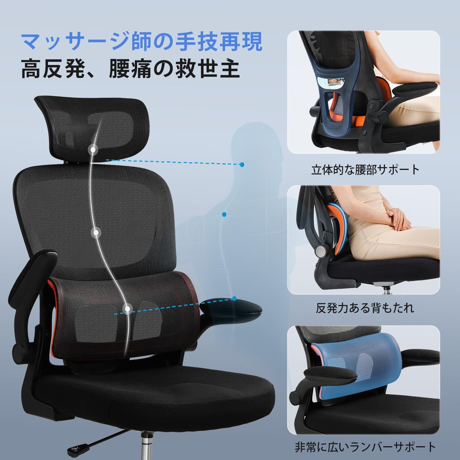 【革新的なランバーサポート!まるでマッサージのような体験】自動回弾性により、まるで専属マッサージ師が腰をほぐしているかのような快適さを実現し、腰痛患者や長時間座る方に確かなサポートを提供します。