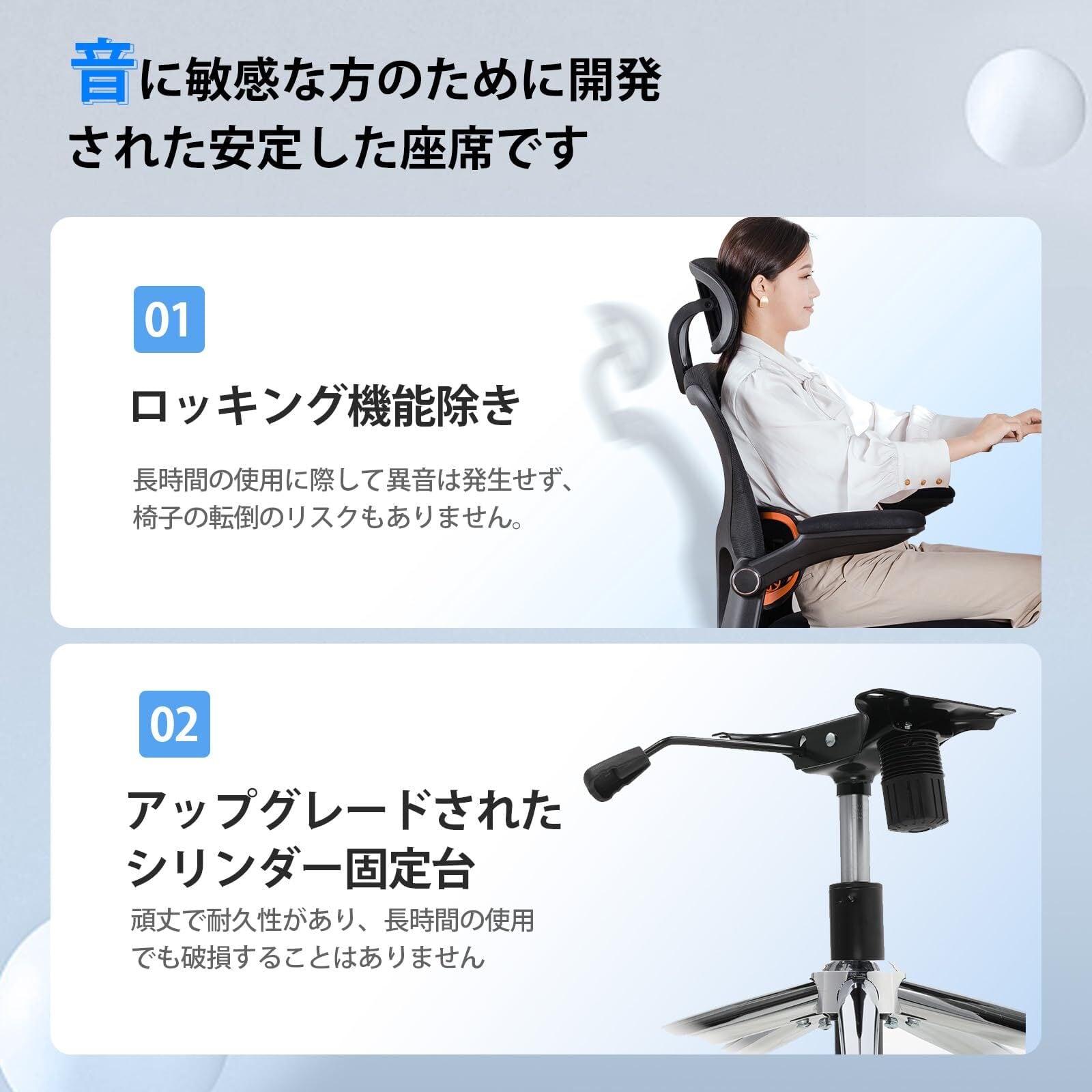 【3Dヘッドレスト付き】高さ調節可能と30°回転できるヘッドレストとロッキング機能が組み合わさり、いつでもあなたの首にフィットし、長時間座っても首の疲れを感じません。