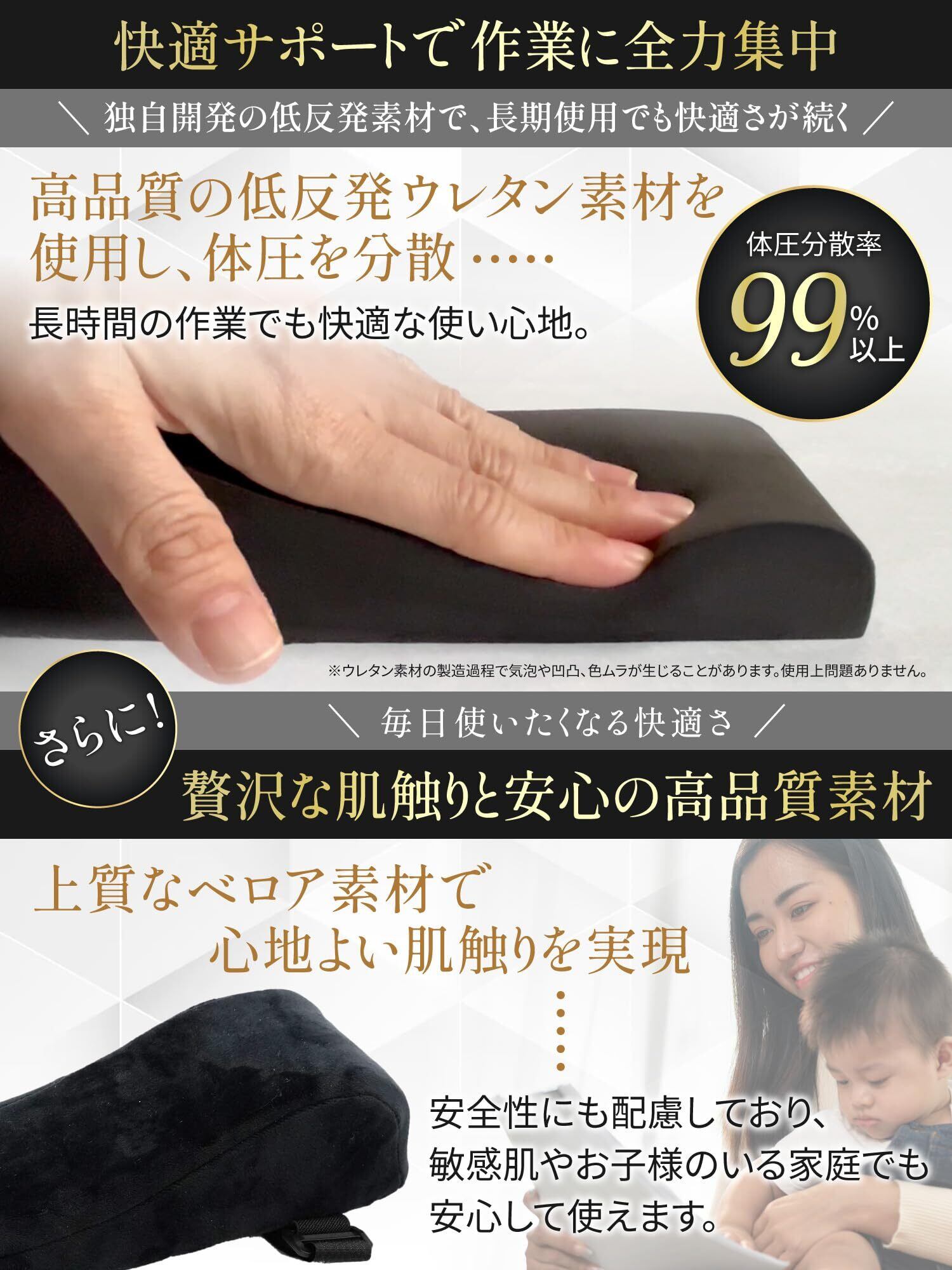 【高密度低反発クッションで抜群のフィット感】体圧を均等に分散する高密度低反発素材を採用。肘や腕を優しく包み込み、まるでオーダーメイドのようなフィット感を実現。沈みすぎず適度な弾力で快適に支えます。