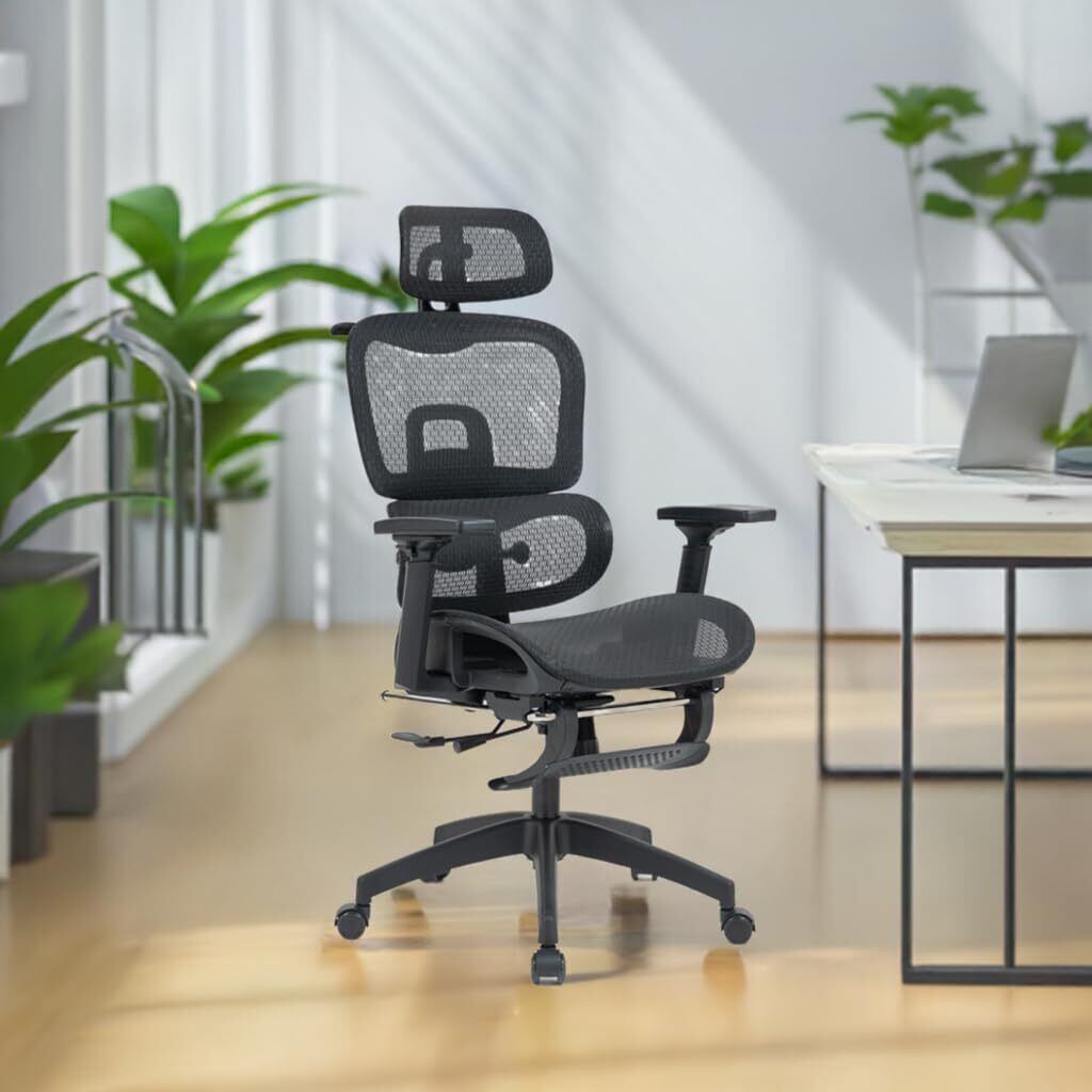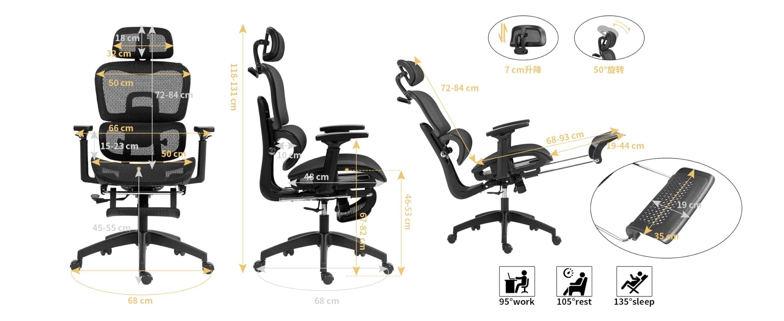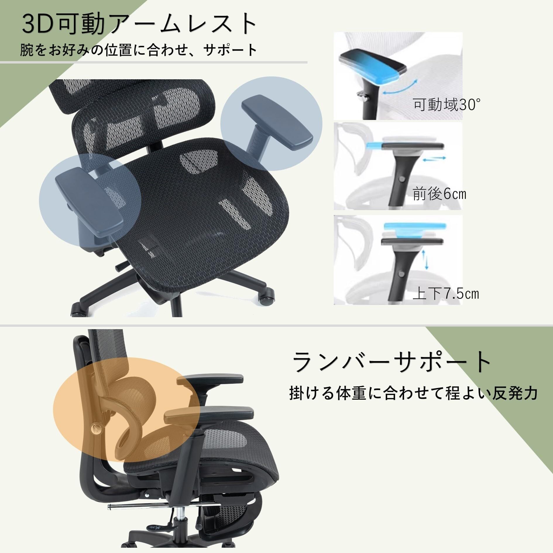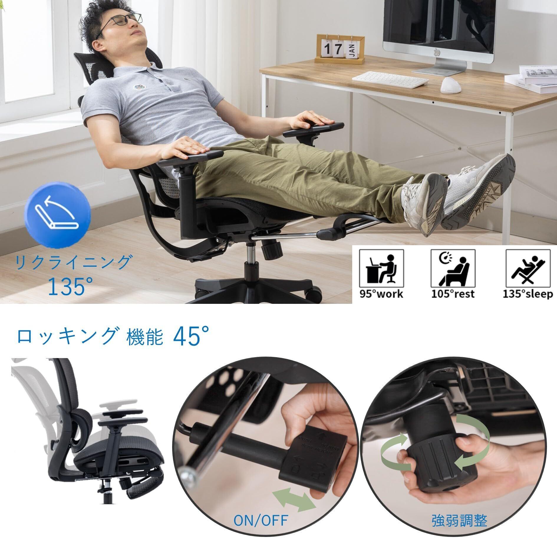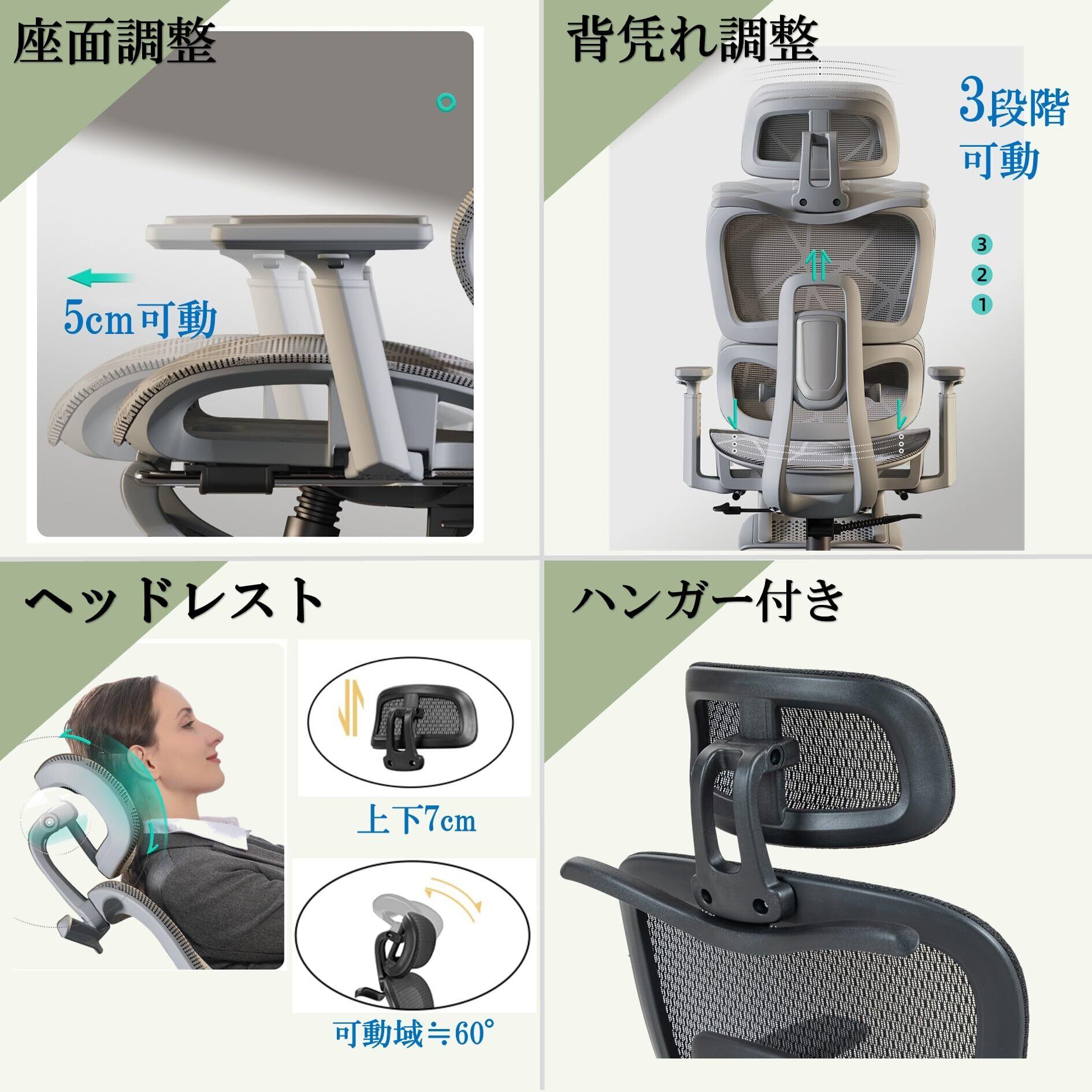 【機能】長時間の作業をサポートする機能を多数搭載。リクライニング、ロッキング機能、背凭れと座面奥行が調整可能、腰が楽になるランバーサポート、腕をサポートする3Dアームレスト、フットレスト・ヘッドレスト付き。