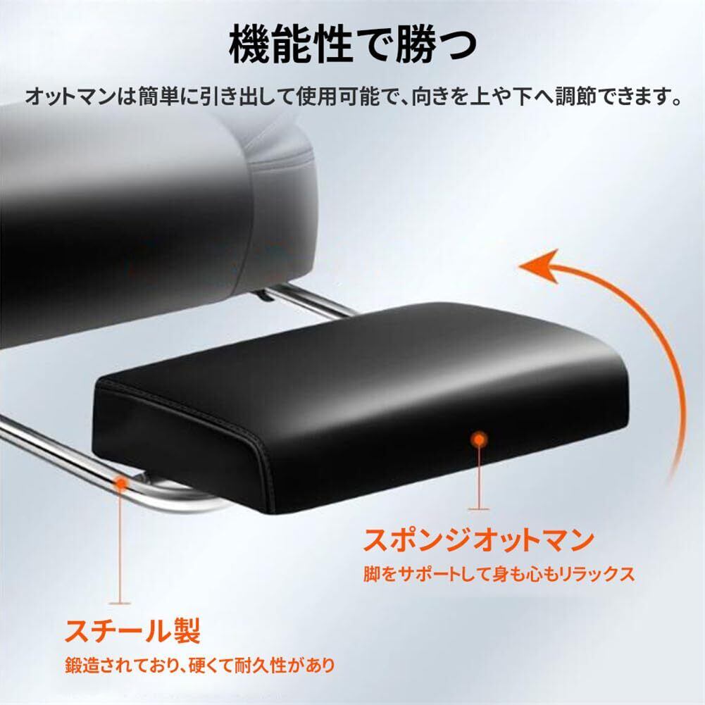 【圧倒的な機能揃え】連動型アームレストにより、どんな角度でも手や肘を完全サポートできます。また、肘が最適なポジションに保たれるため、リクライニング時には自然な姿勢でリラックスできます。座面の下に収納されている足疲れ解消のためのオットマンも付き簡単に休憩でき、よりリラックスした環境を提供します。