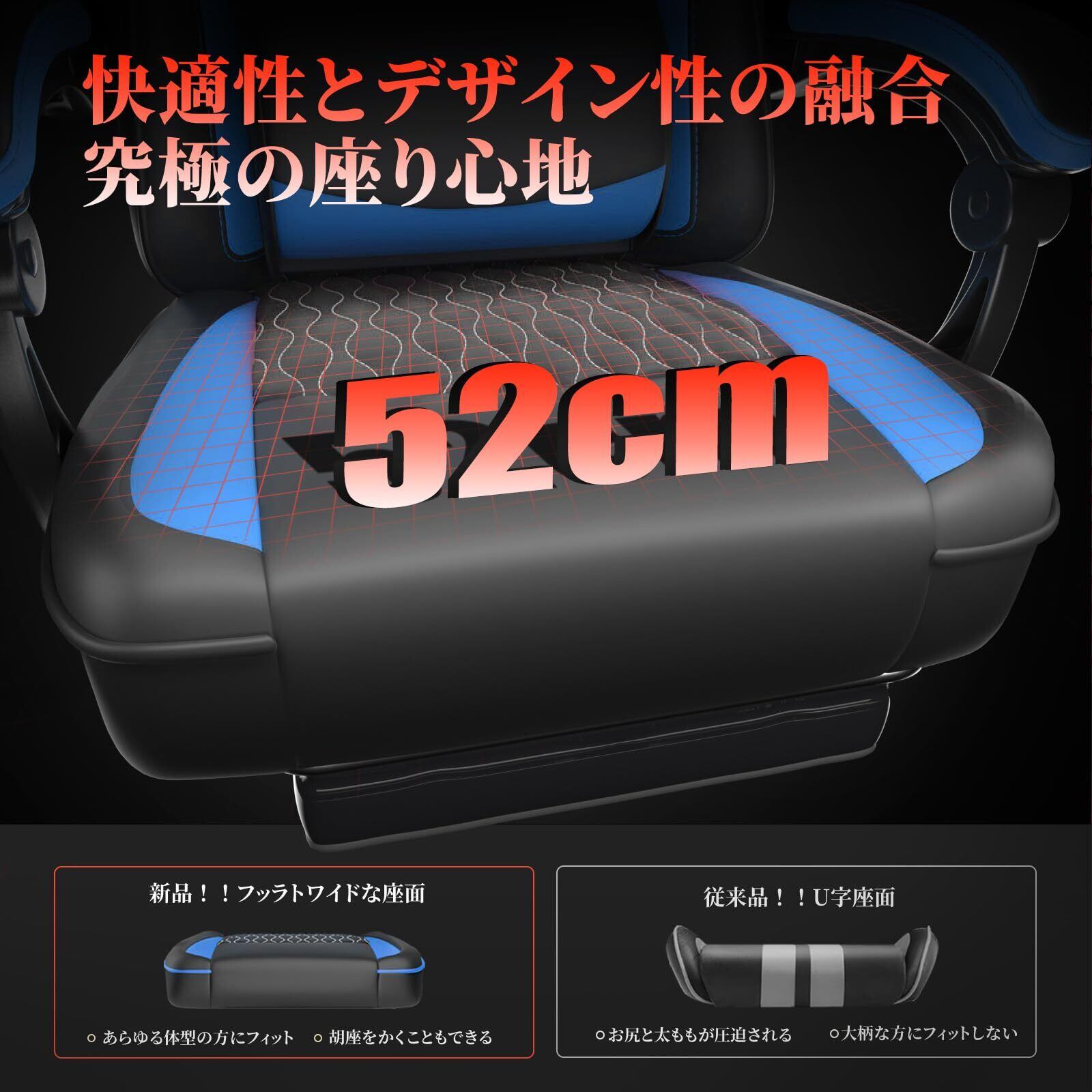【広いフラットシートで快適な使用感】このゲーミングチェアは、幅52cmの広いシートを採用しており、どんな体型の方にもリラックスした座り心地を提供します。従来の座面デザインを刷新し、全体がフラットな設計になっているため、足の動きを妨げることなく、快適に座ることができます。小柄な方には安定した胡座を、大柄な方にはオットマンを使ったリラックスした座り方を実現します。均等な体圧分散により、長時間の使用でも疲れにくく、理想的な快適性を提供します。