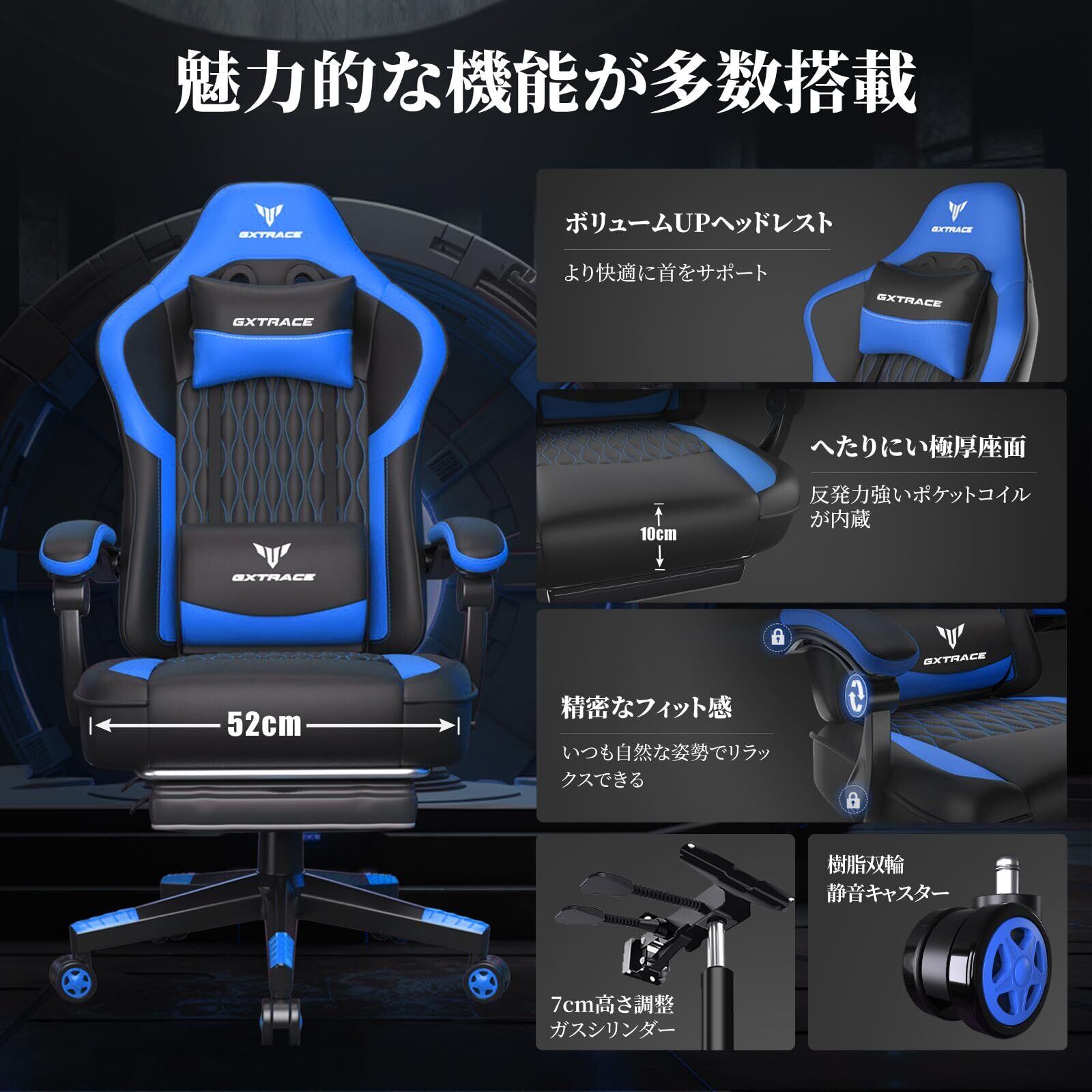 【多機能設計であらゆるシーンに対応】 当社のゲーミングチェアは、座面の角度を最大145°まで自由に調節できる機能を搭載しています。また、取り外し可能なフットレスト、連動するアームレスト、上下に7cm調節可能な高さ、360°回転する機能が備わっており、さまざまな姿勢に対応します。仕事やゲーム、リラックスした休息の際に最適なポジションを見つけることができ、用途に合わせて柔軟に使用できます。
