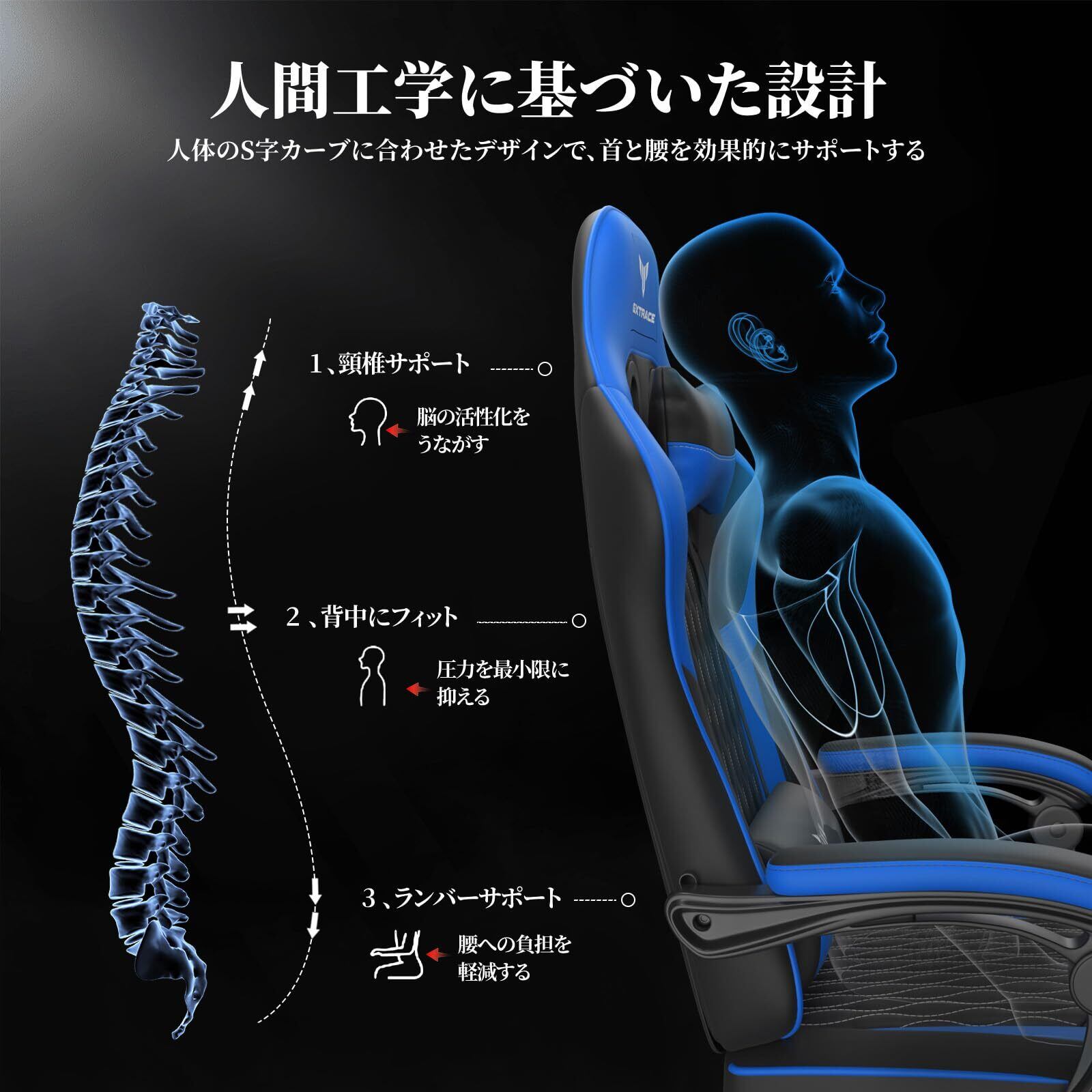 【エルゴノミックデザインと上質素材】 ゲーミングチェアは、人間工学に基づいたS字形のデザインで、首と腰に特に配慮したサポートを提供します。体に自然にフィットし、長時間の使用でも快適さを維持します。さらに、高密度のスポンジと耐久性のある通気性素材を使用しており、長時間座っても形が崩れず、夏場でも快適です。このデザインと素材選びにより、長く使用できる高品質な座り心地を実現しました。