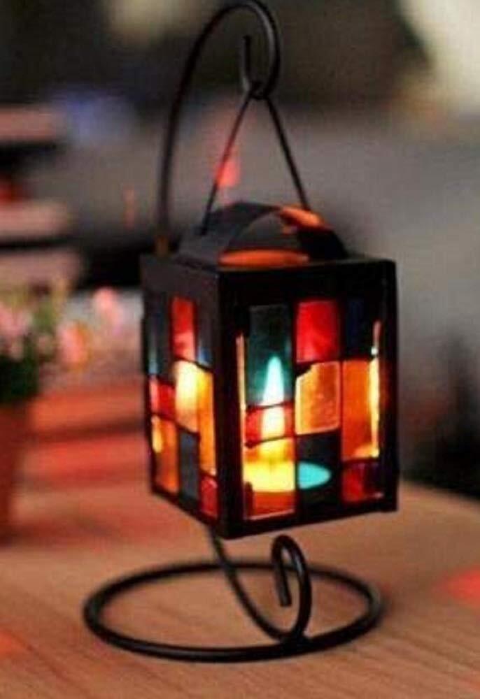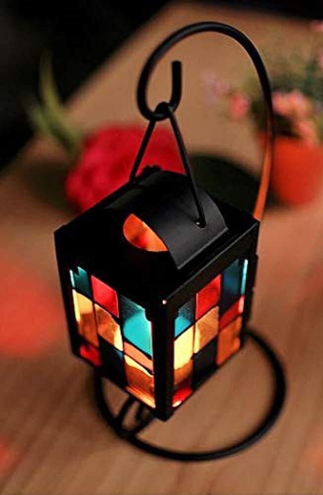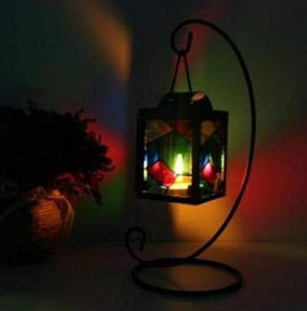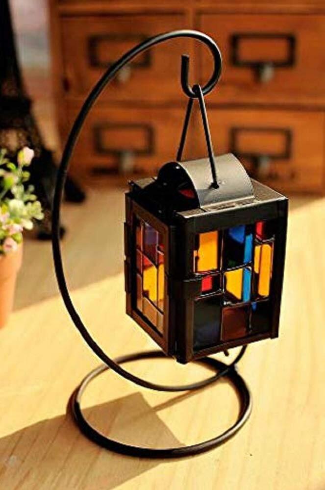 【morningplace】北欧 キャンドル スタンド ホルダー アンティーク 吊りフック付き ステンドグラス 格子デザイン インテリア に (ブラック)