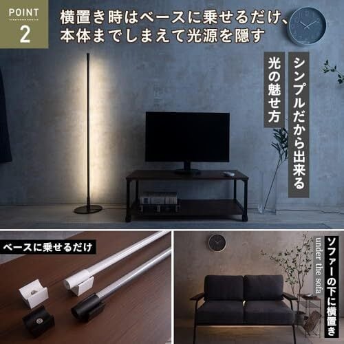 Point 2.【横置き時はベースに乗せるだけ、本体までしまえて光源を隠す】 Liioは縦置きと横置きを自由に変えることができます。縦置き時は本体を回して台座に固定し、横置き時は付属のベースに乗せるだけと、非常に簡単です! 横にして暗い廊下の足元照明として使ったり、ソファの下に横置きで置くだけで、高級感が一層アップします。 マグネット式のベースに乗せる角度を変えるといろんな方向180度に光を出すので、本体の向きを変えるだけで簡単に光源を隠すことができます。家具の背後などに光源を仕込むことで、照明器具の存在を隠し、反射する光だけを見せる演出はよりおしゃれ度が高まります。Point 3.【縦置き時はミニマリズムを極めたデザインと、間接照明の役割を十分に果たす存在感】 洗練された極めてシンプルなデザインから、本体が見えても広々とした空間が楽しめます。縦にする場合は台座部分には20cm四方の隙間があればお使い頂けます。細長いボディは、シンプルモダンテイストのお部屋のインテリアとして最適で、玄関照明として、寝室ランプとして照明の役割を果たしながら、消灯時にはインテリアと一体化してくれます。