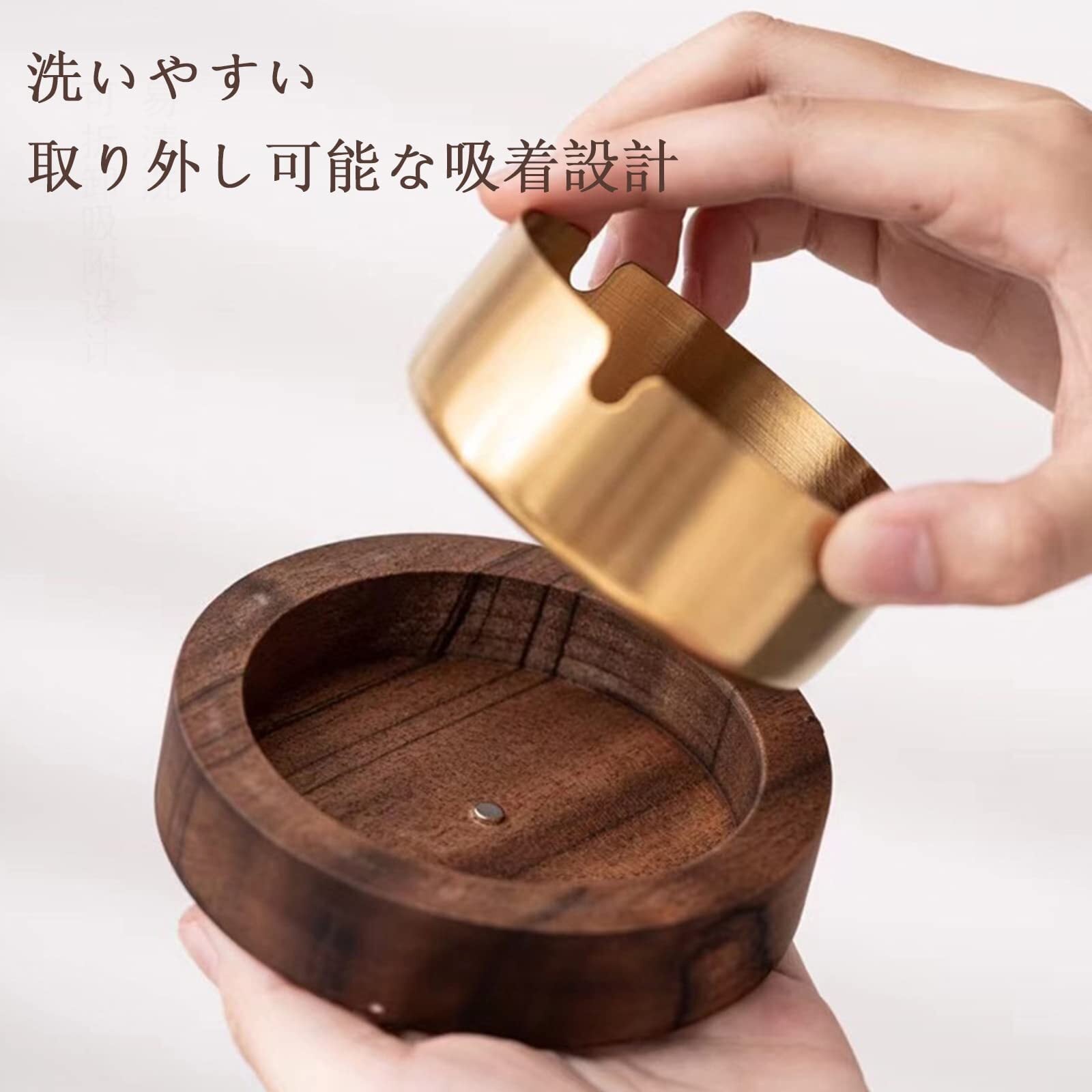 【機能的なデザイン】蓋付き灰皿なので蓋を閉めれば灰が飛び散る心配がありません。タバコの灰の飛び散りや嫌なニオイが部屋の中に広まるのを抑えることができる。天然木のフタも、裏返してちょっとした小物置きに活用でき、便利です。タバコを仮置きする三つの溝があります。また開口部が広く吸殻を捨てやすい構造になっています。分体設計:中のステンレス製灰皿は取り出して丸洗いが可能。