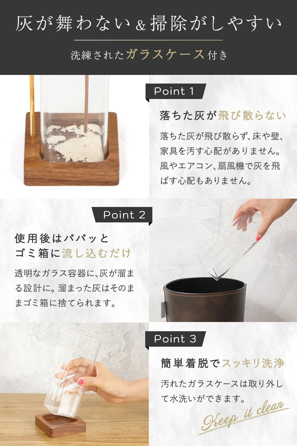 ️【清潔を保てる】透明なガラス容器に灰が溜まる設計のため、灰が家具に落ちて汚れたり風で飛んで部屋を汚す心配がありません。また水洗いも可能なのでいつまでも清潔にお使いいただけます