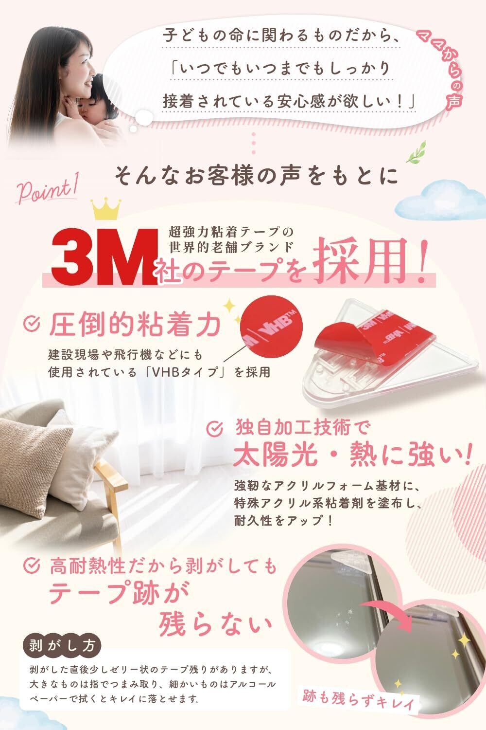 【世界トップクラスの接着力】両面テープの老舗ブランド「3M」社の両面テープを採用。建設現場や飛行機にも使用されているVHBシリーズを採用。さらに独自の加工で太陽光・熱に強く、剥がした後もテープ跡が残りません。幼児の転落防止対策、一時的な防犯対策、猫や犬の脱走防止など様々な用途に安心してご使用いただけます。