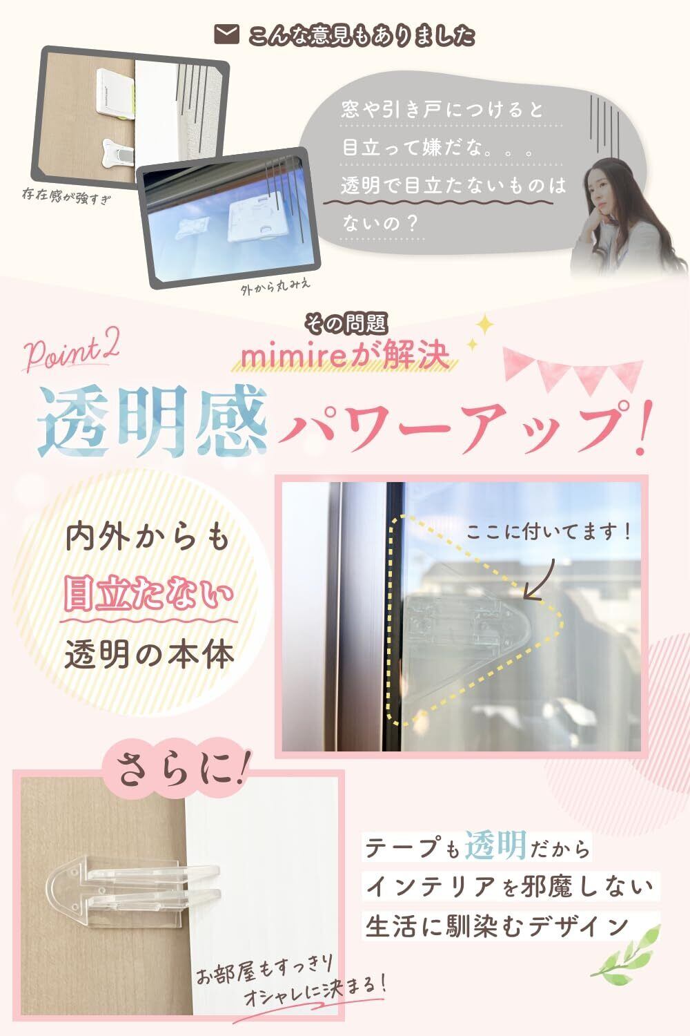 【目立ちにくく、インテリアに馴染む】窓や引き戸、網戸に設置しても目立ちにくいよう、本体と両面テープを透明にしました。内外どこから見ても目立ちません。