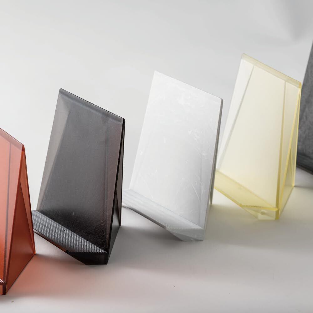 カラーは全5種類。半透明のレッド、イエロー、グレー、杉の皮を配合したブラック、マーブル調のグレーから、お好みの色をお選びください。
