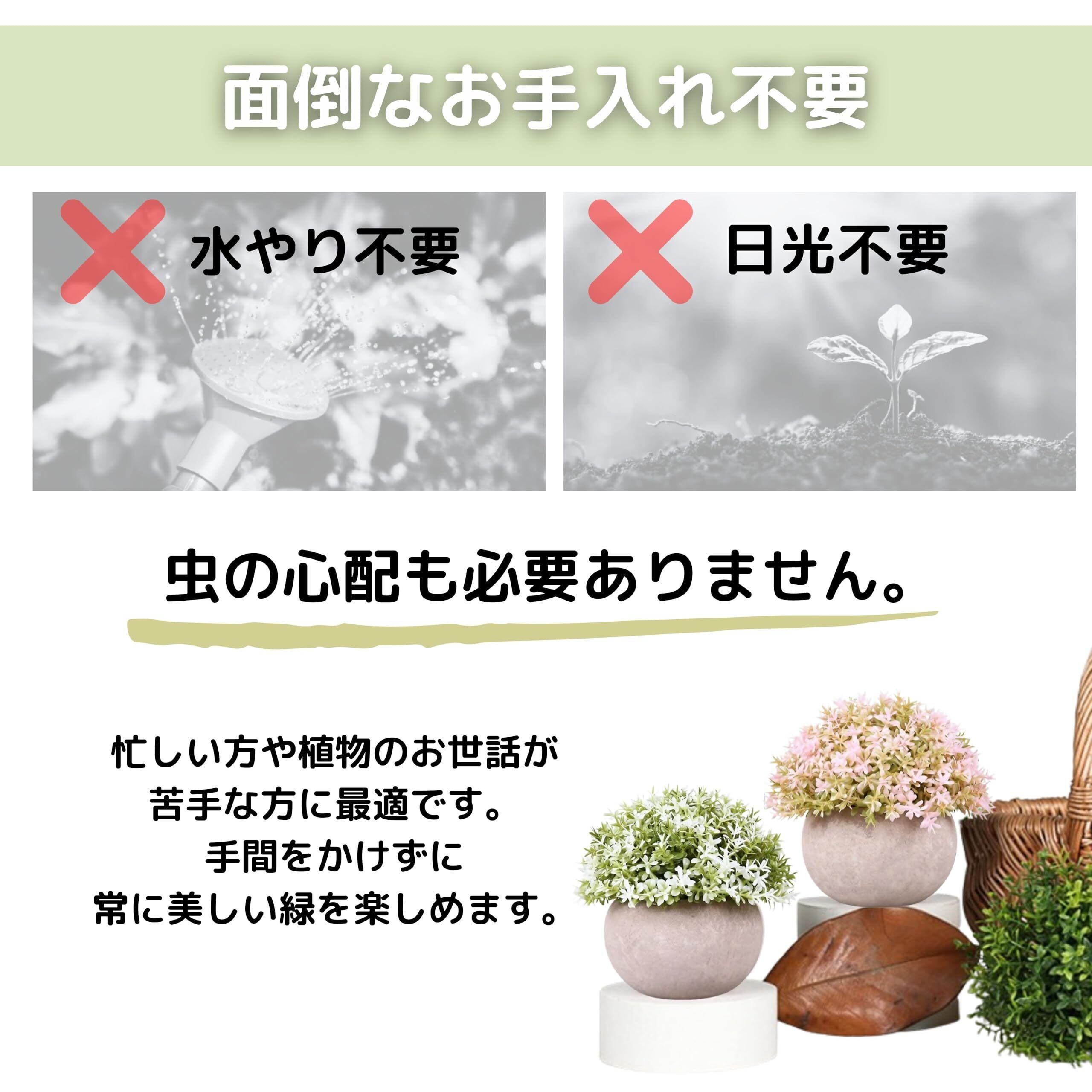 【お手入れ不要】水やりや日光が不要で、虫の心配もゼロ。忙しい方や植物のお世話が苦手な方に最適で、手間をかけずに常に美しい緑を楽しめます。