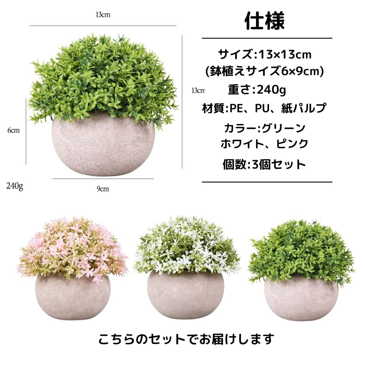 【仕様】サイズ:13×13cm(鉢植えサイズ6×9cm)、重さ:240g、材質:PE、PU、紙パルプ、カラー:グリーン、ホワイト、ピンク、個数:3個セット