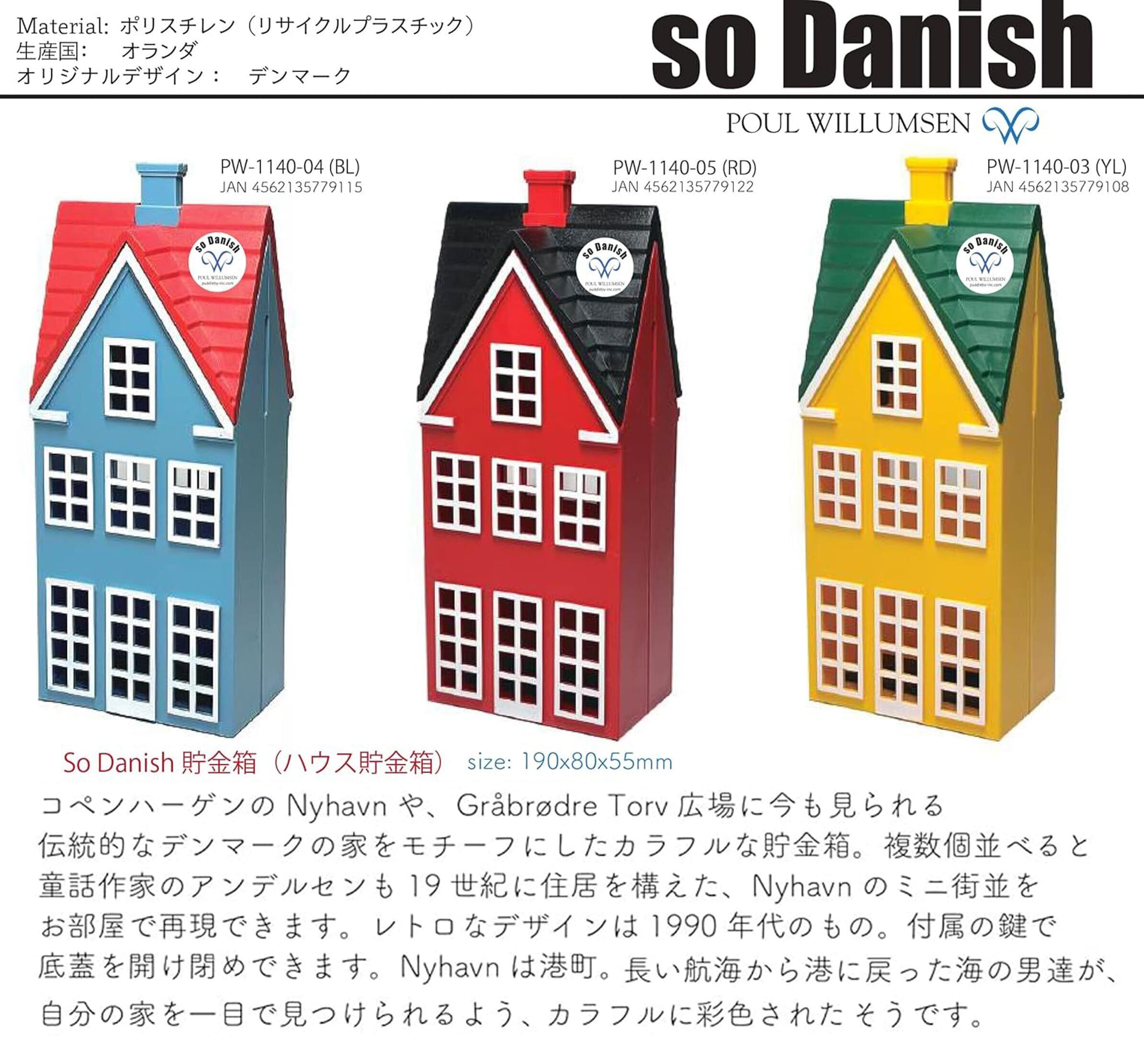 90年代のデンマークでデザインされた貯金箱が、リサイクルプラスチック製になって新たに復活しました。カラフルな色合いは、実際のデンマークの伝統的な家から取られたもので17世紀頃の様式。今でもコペンハーゲンなどの街中に、同じような家が残っています。