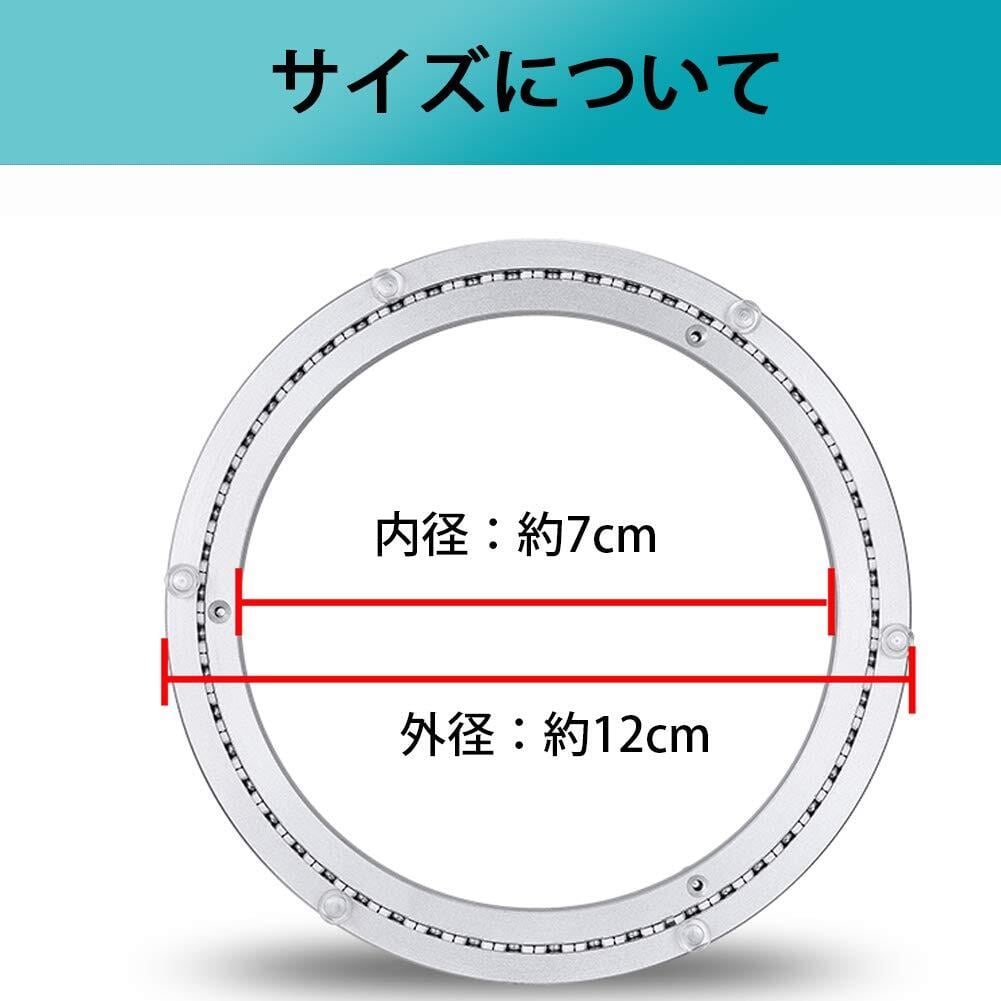 【商品仕様】素材: アルミニウム合金;製品サイズ:4 インチ (内径: 7cm /2.76 インチ、外径: 12cm /4.72 インチ、高さ: 8.5MM /0.33 インチ);パッケージ重量: 約 180g~470g;パッケージに含まれるもの:テーブルベアリング x 1