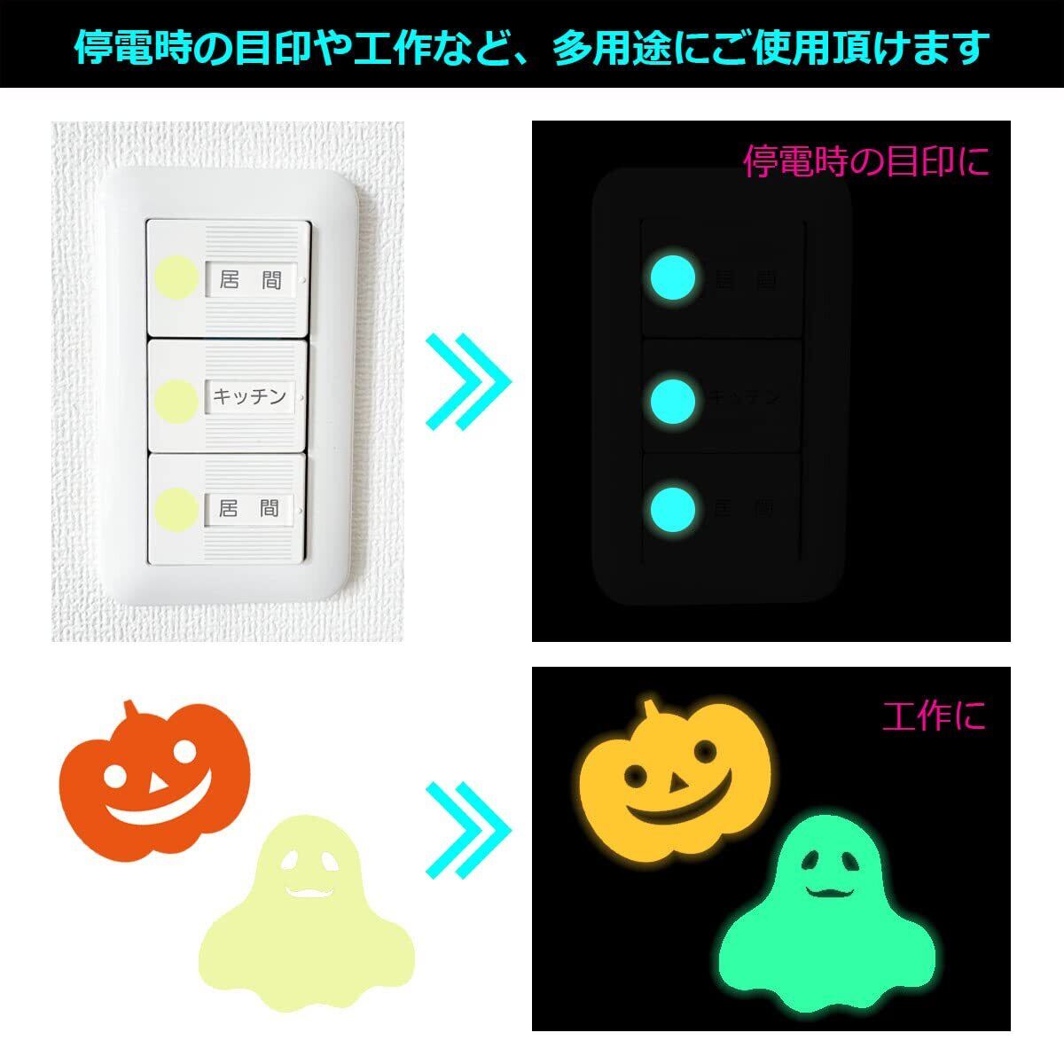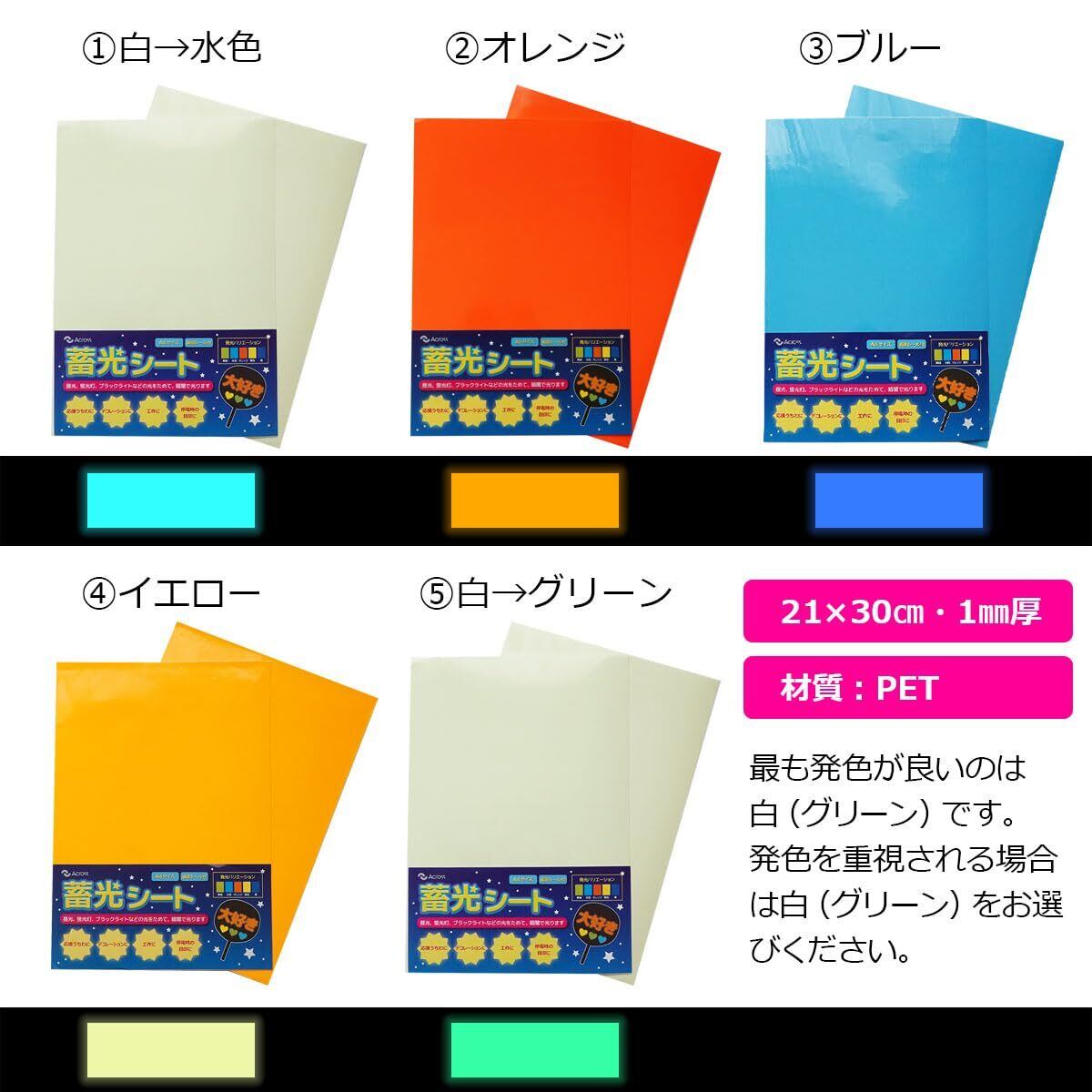 【色が選べる!5パターン】暗闇で発光すると色が変わります。 ・白→水色 ・オレンジ→明るいオレンジ ・ブルー→明るいブルー ・イエロー→明るいイエロー ・白→グリーン ※最も発色が良いのは白(グリーン)シートです。発色を重視される場合は白(グリーン)をお選びください。
