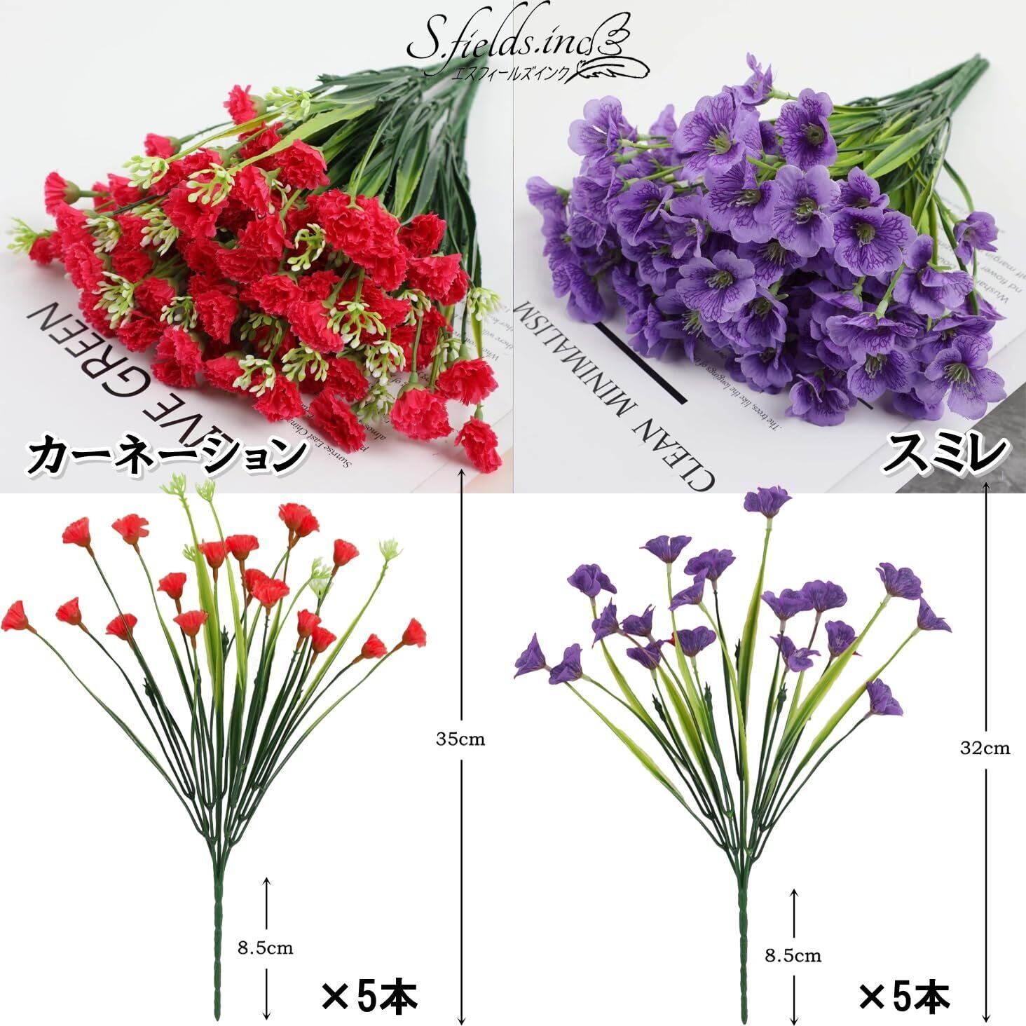 【サイズ】カーネーション:高さ35cm / すみれ:高さ32cm【カラー】カーネーション:レッド / すみれ:パープル【材質】プラスチック・シルクフラワー【セット内容】5束