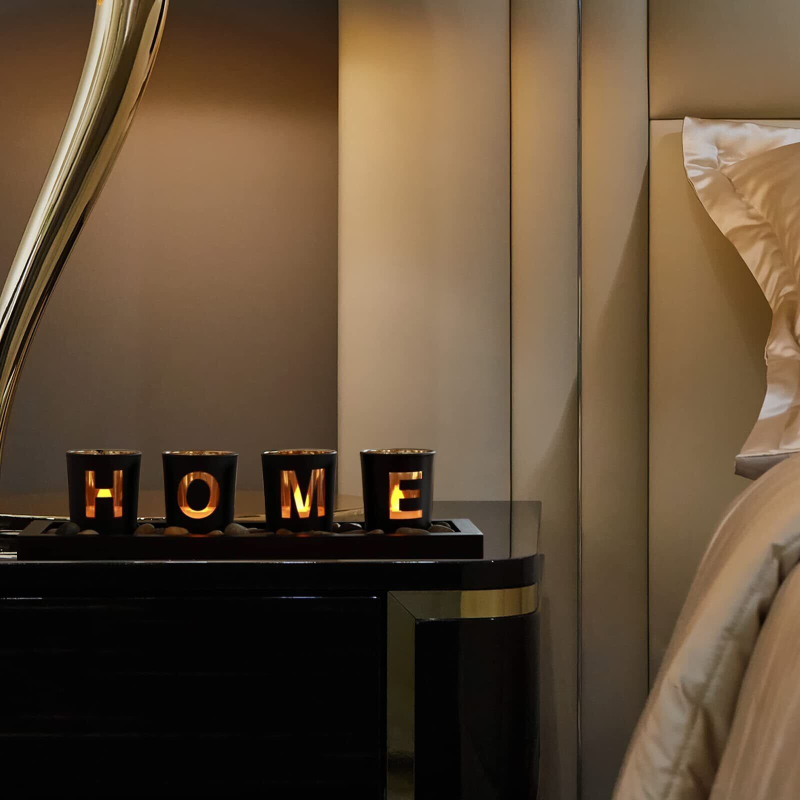 「素晴らしいデザイン」キャンドルホルダー セットはガラス製のキャンドルスタンド4個、トレイ一枚、小石1袋をセットしております。キャンドルホルダーの内装は金色を塗って、火付けた時、光が切り抜いたHOMEの文字を通して輝いていて、雰囲気がレベルアップします。