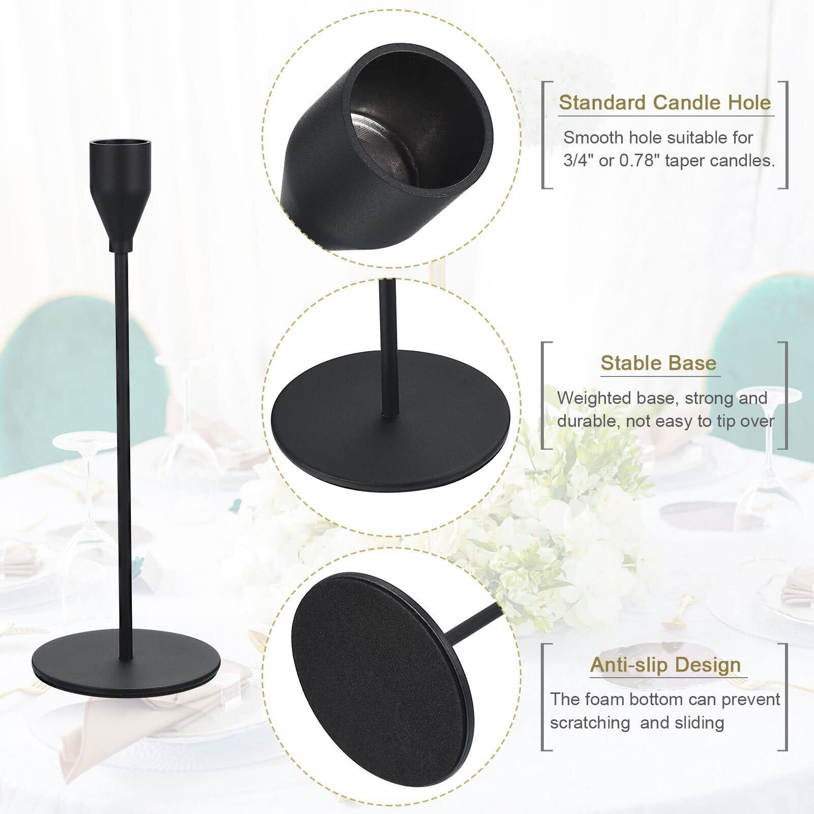 これらの先細キャンドルホルダーは固体金属で作られています。パッド黒の表面デザインは美しくエレガントで、エレガントな印象を与えます。キャンドルホルダーは防錆、耐腐食性があり、重みのあるベースが装備されており、強くて耐久性があり、転倒しにくいです。各テーパードキャンドルホルダーの底には滑り止めフォームが付いており、テーブルトップを傷つけません。