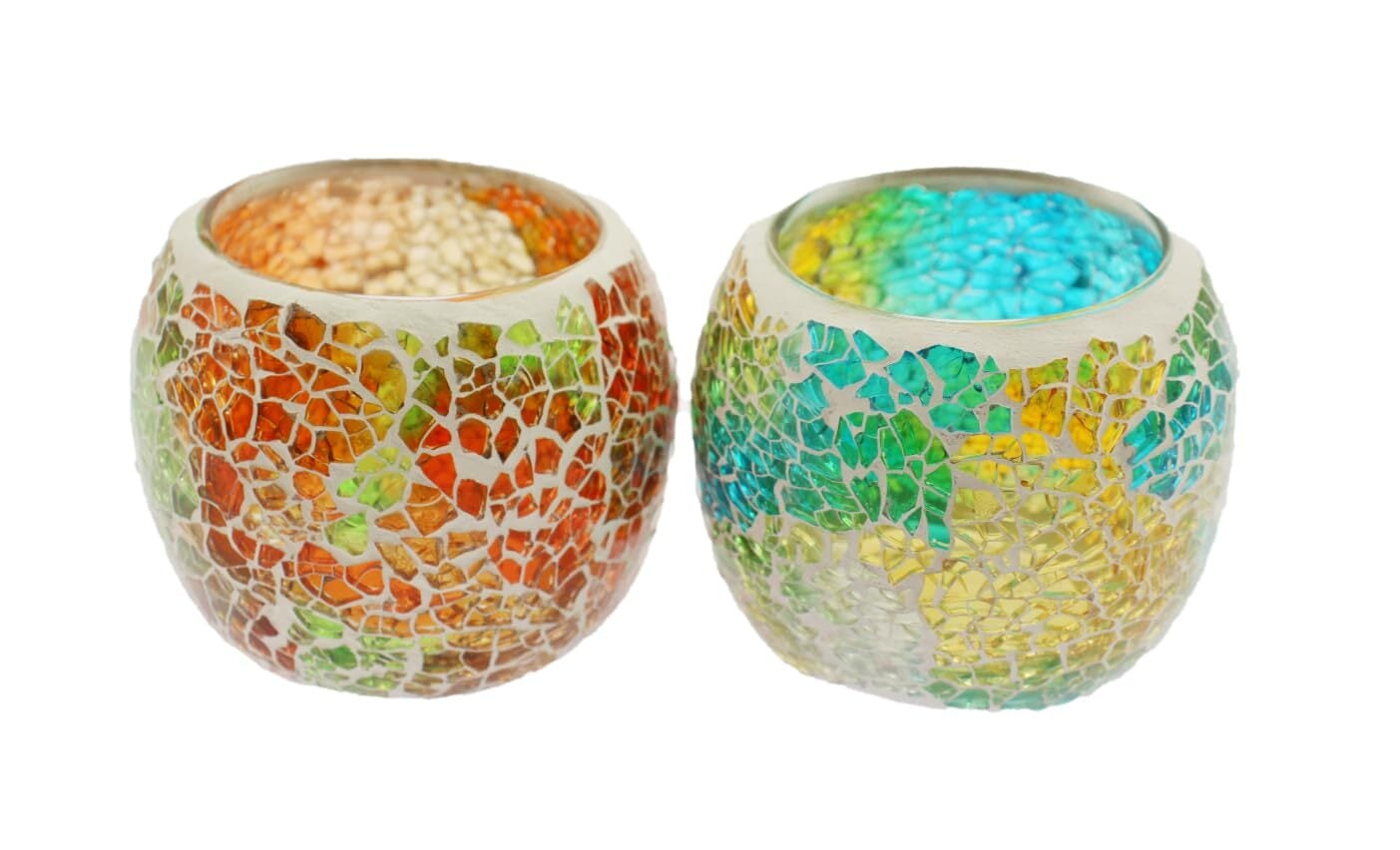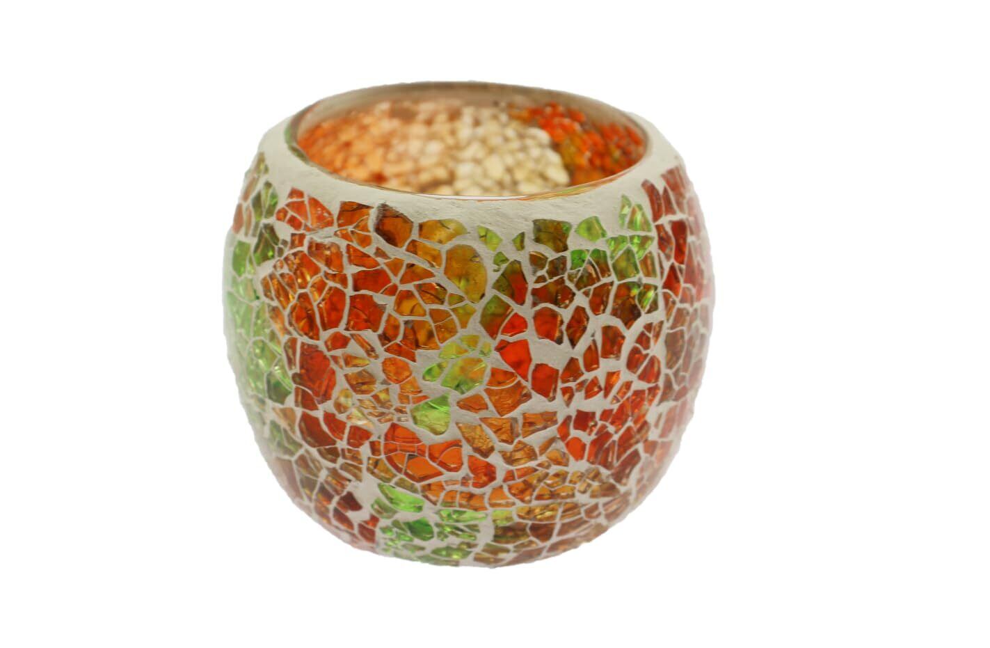 貼り付けられたモザイクガラスが美しいおしゃれなキャンドルホルダーです。