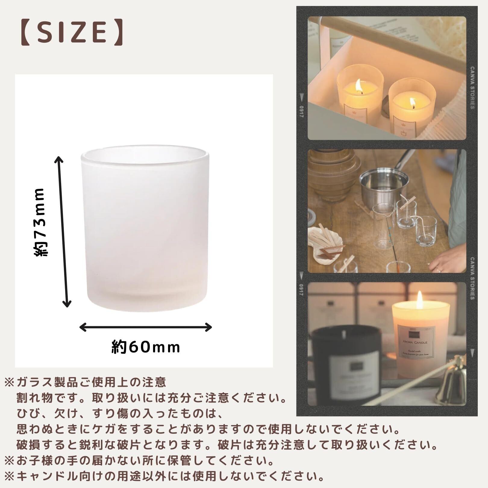 ※ガラス製品ご使用上の注意:割れ物です。取り扱いには充分ご注意ください。ひび、欠け、すり傷の入ったものは、思わぬときにケガをすることがありますので使用しないでください。破損すると鋭利な破片となります。破片は充分注意して取り扱いください。お子様の手の届かない所に保管してください。キャンドル向けの用途以外には使用しないでください。